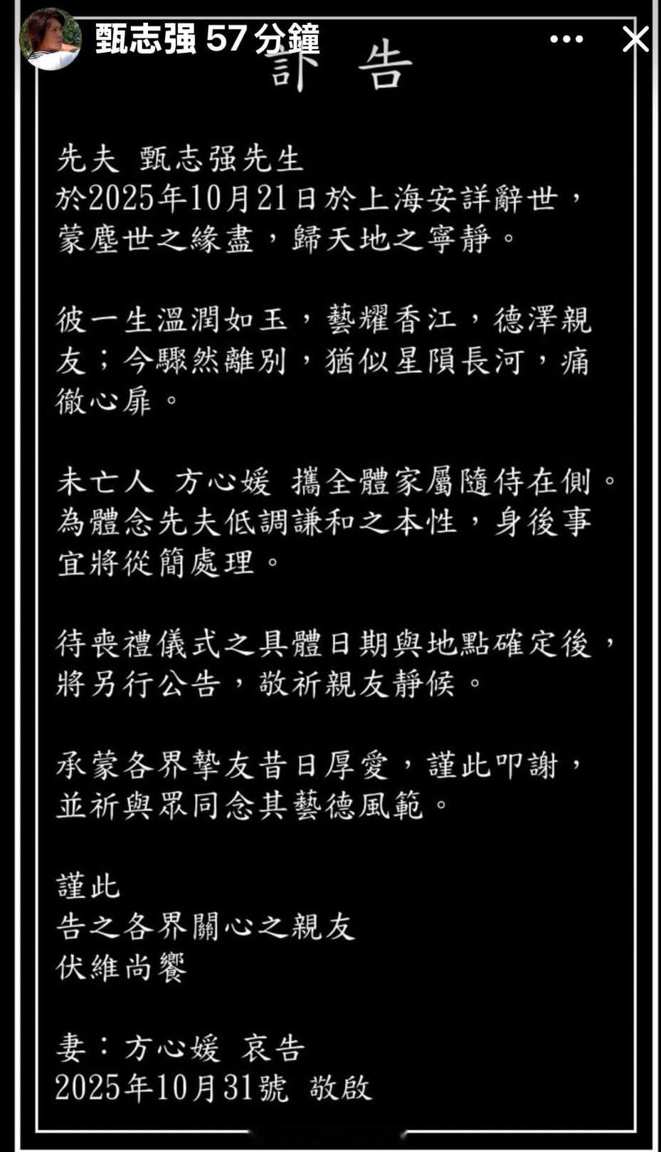 甄志强太太方心媛今日发讣文说:"先夫甄志强先生于2025年10月21日于上海安详辞世,蒙尘世之缘尽,归天地之宁静。彼一生温润如玉,艺耀香江,德泽亲友;今骤然离别,犹似星陨长河,痛彻心扉。未亡人方心媛携全体家属随侍在侧。为体念先夫低调谦和之本性,身后事宜将从简处理。待丧礼仪式之具体日期与地点确定后,将另行公告,敬祈亲友静候。承蒙各界挚友昔日厚爱,谨此叩谢,并祈与众同念其艺德风范。谨此告之各界关心之亲友伏维尚飨 妻:方心媛哀告 2025年10月31号敬启"