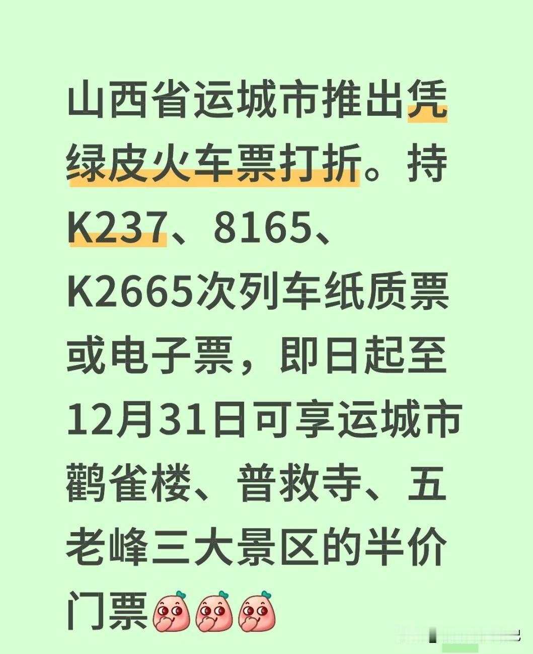 武汉铁路局开通绿皮非空调列车,这次没到襄阳,估计是为了保高铁客流。11月1日,汉口到云梦的车票居然卖空了[捂脸][捂脸][捂脸]要是沿线城市文旅景点凭绿皮火车票景点打折,说不定还会带动文旅景点发展和城市文旅业从。这是不是有点痴心妄想[笑哭][笑哭][笑哭]