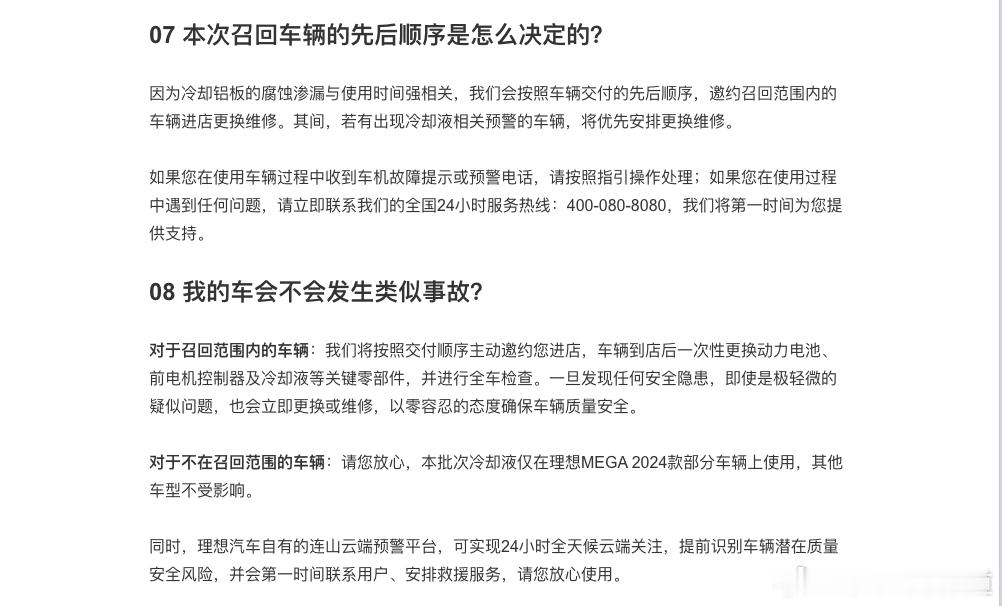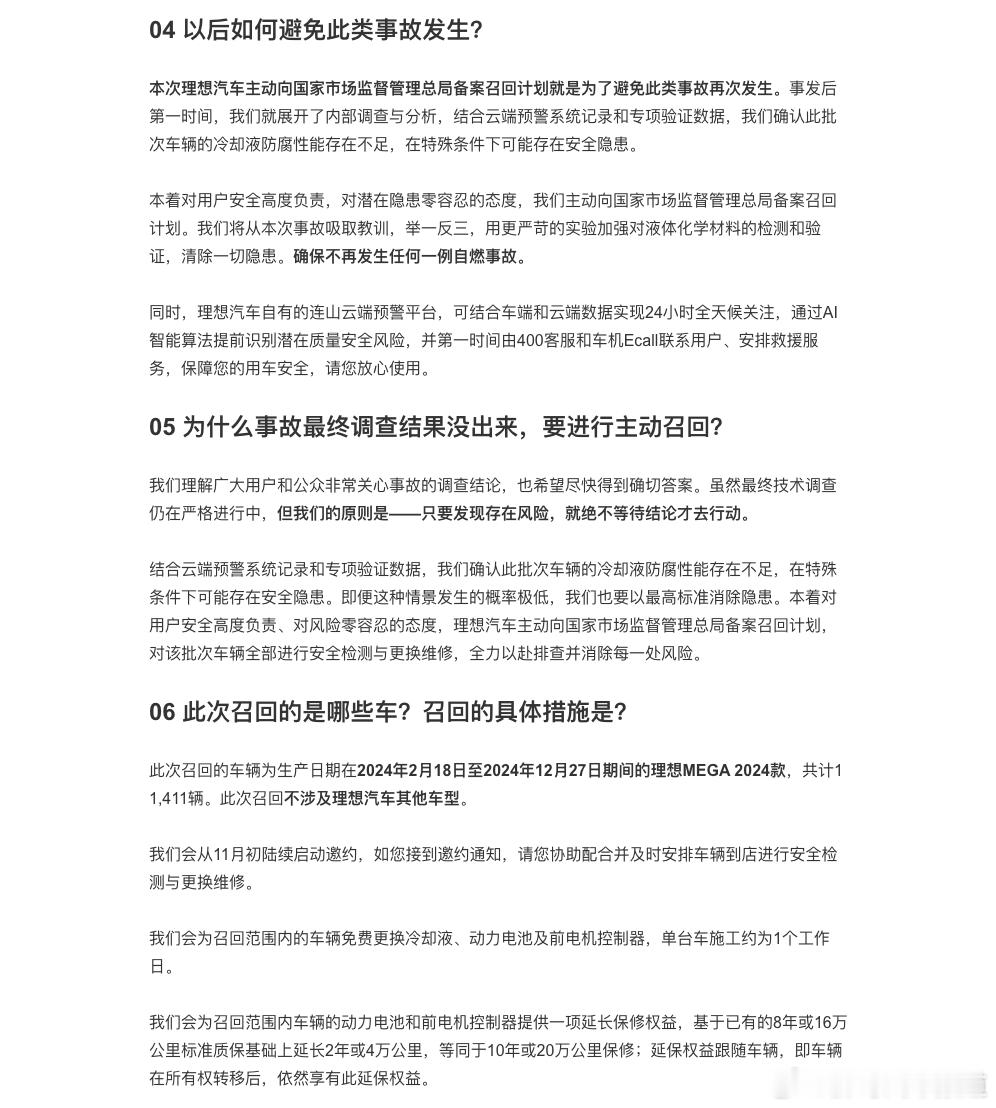 秉着对安全负责的态度,现针对事故同批次理想MEGA进行召回,进行安全监测及更换维修。