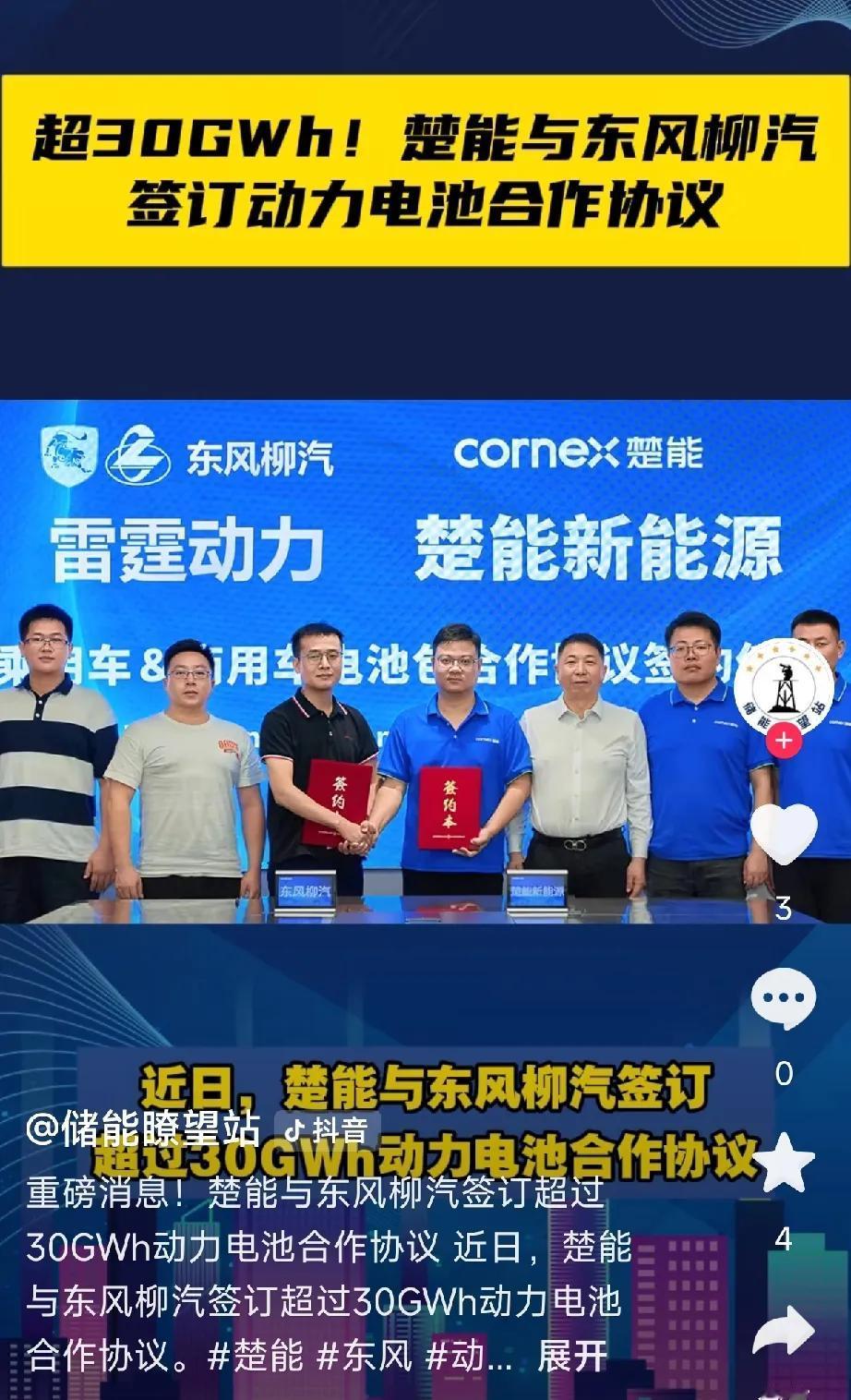 近日楚能动力电池投资襄阳备受关注,目前楚源在全国动力电池份额占比大概为0.7-0.9%之间。 那么楚能为何投资襄阳?是不是和东风搭上线了? 楚能新能源与东风集团的合作主要体现在与其子公司东风柳汽的合作上。 合作形式与规模——双方已在2025年8月签署了动力电池开发合作协议。根据协议,楚能新能源将在未来五年内向东风柳汽提供超过30GWh的电池产品,覆盖乘用车和商用重卡等多种车型。 合作历史:事实上,双方的伙伴关系早已开始。楚能新能源自2023年起就开始为东风集团的车型提供电池解决方案,并在2024年因出色的合作获得了东风颁发的"突出贡献奖"。 配套车型进展:在工信部2025年发布的产品公告中,已出现了至少4款搭载楚能 磷酸铁锂电池的东风牌新能源车型,表明合作已进入实质性落地阶段。 楚能电池主要合作对象就是东风柳汽雷霆动力,目前东风不持股楚能新能源,也没有建立合资公司。 不过东风和欣旺达在宜昌成立了合资公司,东风集团持股49%,他可能就是东风自主动力电池马赫E的生产地。马赫电池主供奕派科技三品牌和风行品牌。 欣旺达全国市场占比4%,已经处于提升状态,主要是奕派科技、风行、东风日产N7等客户支持了不少份额。 宜昌貌似还有宁德时代的子公司! 东风岚图、猛士科技和东风商用车、东风股份等均与宁德时代有合作关系。东风智新科技持股时代一汽新能源动力电池公司15%的股份。岚图的琥珀电池由哪家工厂生产呢? 岚图琥珀电池,奕派马赫电池,风行雷霆电池,启辰鲁班电池,东风具备电池封装技术,但是大多由合作伙伴生产制造。 东风新能源汽车貌似还和中创新航、孚能、赣锋锂电、亿维等有合作。 关于东风与亿纬锂能(EVE)的合作,目前公开的项目信息主要集中在商用车领域,特别是与东风柳汽和东风商用车的合作。 [太阳][太阳][太阳] 2026年东风固态电池车型也会落地,据说首搭车型可能是奕派科技旗下车型。 2025年10月20日,东风把固态电池的全套技术都搞定了,电解质、隔膜、固化工艺,样样都自己做,电池能量密度做到每公斤二百四十到三百五十瓦时,跑1000公里没问题,穿刺、挤压、高温烘烤,国家最严的测试都过了。 2025年,10 月 23 日欣旺达出了款叫 “欣・碧霄” 的全固态电池,能量密度 400Wh/kg,循环寿命 1200 周。