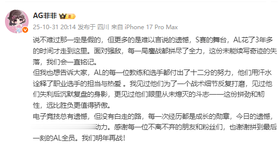 虎扑10月31日讯2025全球总决赛八强赛AL2-3不敌T1,止步八强。赛后,AG老板菲菲发文: