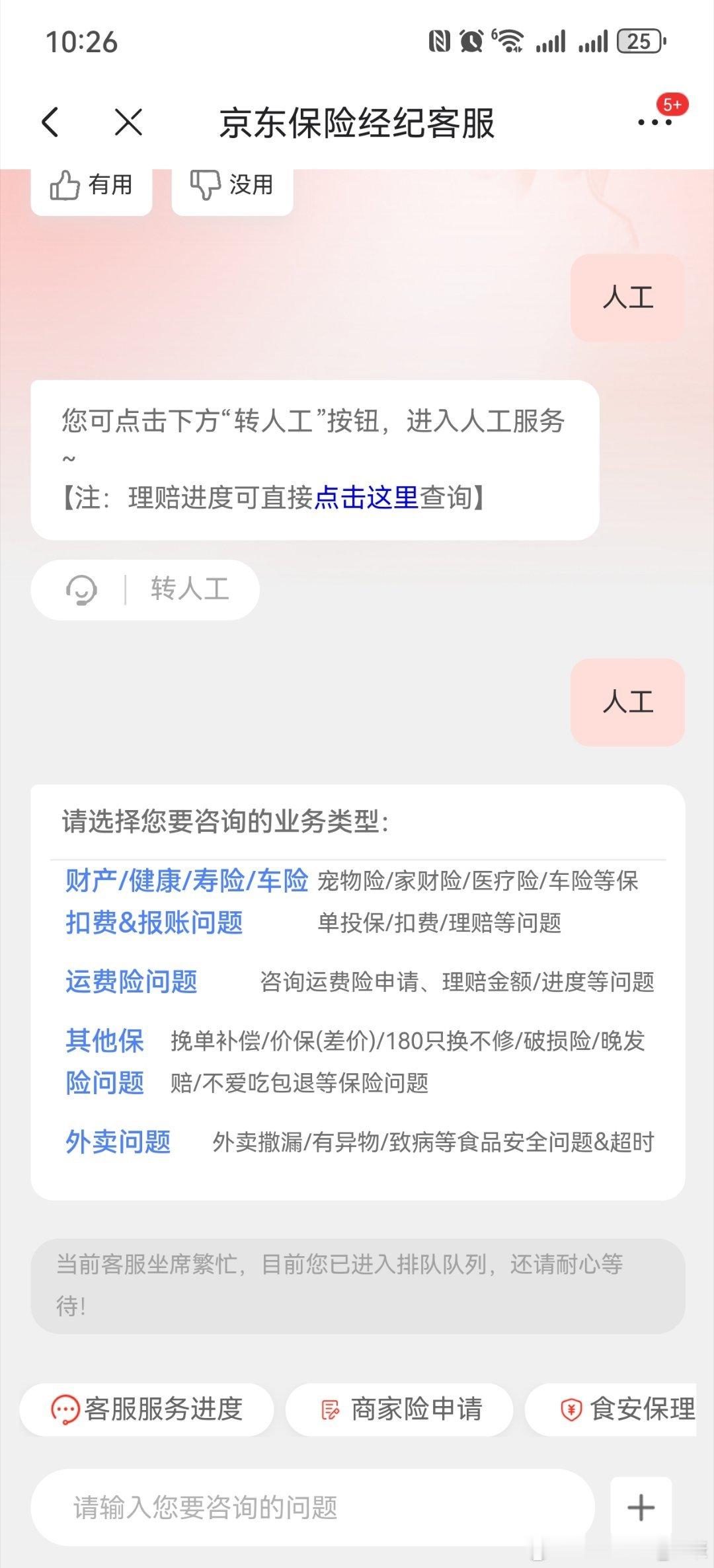 买床垫遇到降价,找客服申请价保,告知“联系保险客服”,跳转以后,一直机器人重复,要么就是排队[微笑]