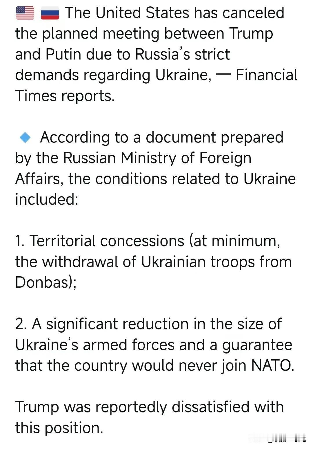 据《金融时报》报道,由于俄罗斯对乌克兰问题提出严格要求,美国取消了原定的特朗普与普京的会晤。 根据俄罗斯外交部准备的一份文件,与乌克兰有关的条件包括: 1. 领土让步(至少包括乌克兰军队从顿巴斯撤出); 2.大幅削减乌克兰武装部队的规模,并保证该国永远不会加入北约。据报道特朗普对这一立场不满意。