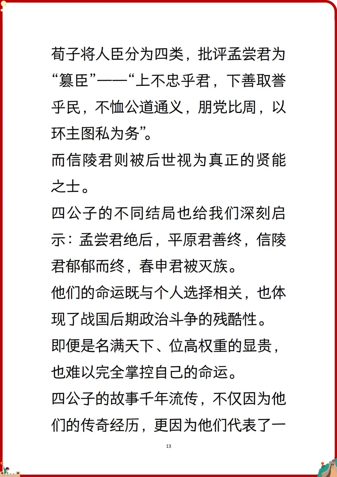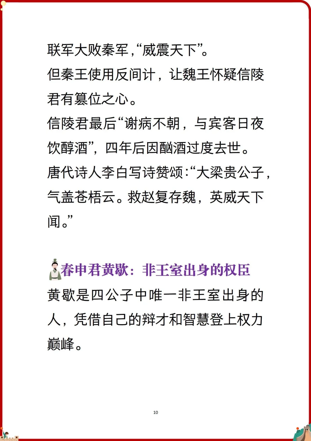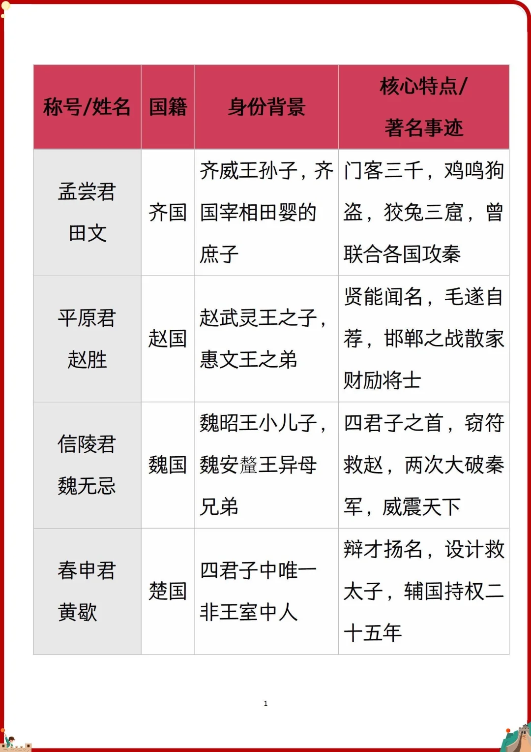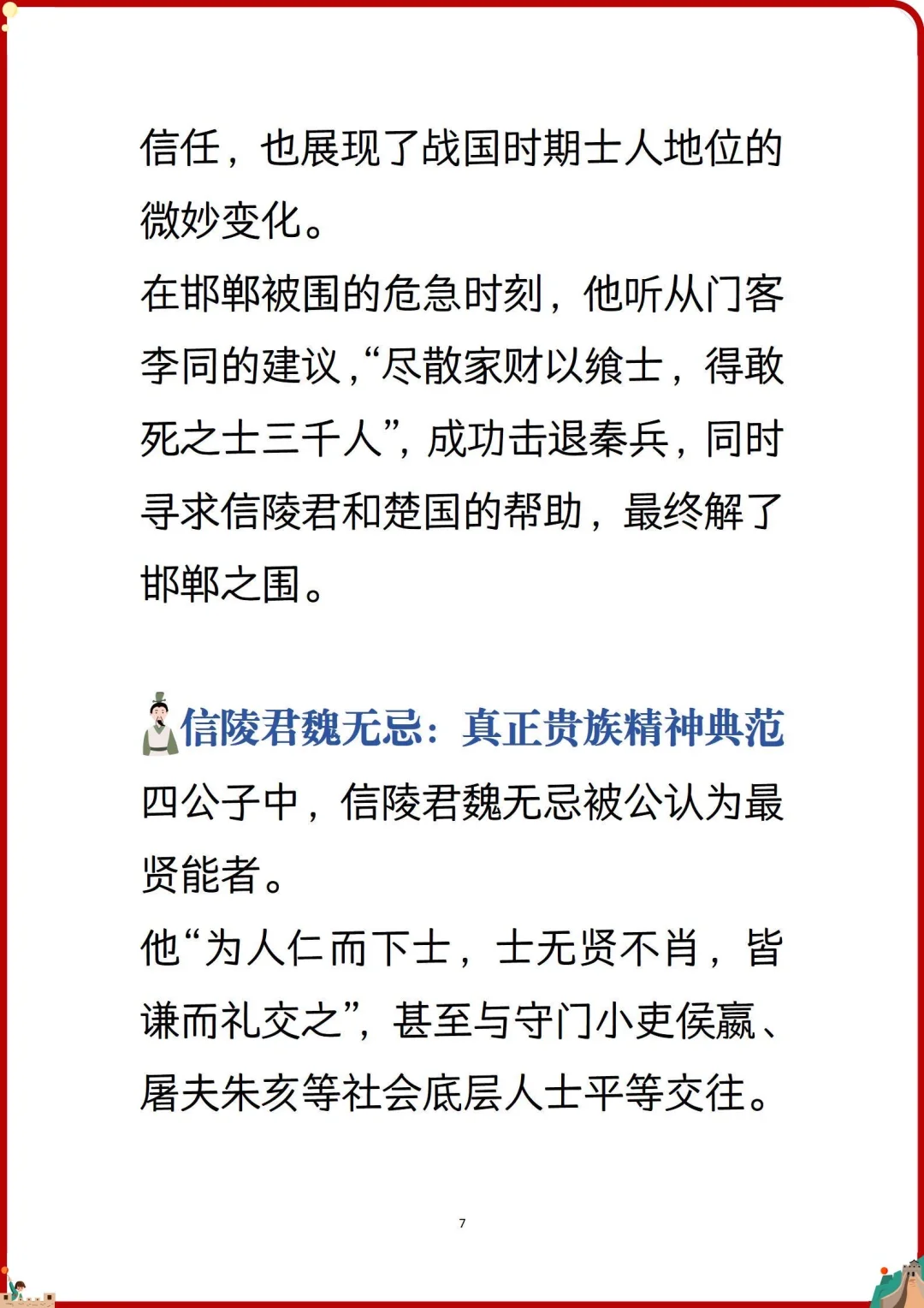 记录吧就现在 [吧唧R]战国四公子,指齐国的孟尝君田文、赵国的平原君赵胜、魏国的信陵君魏无忌和楚国的春申君黄歇。 [大笑R]他们均以礼贤下士、结交宾客而闻名于世,每人门下都豢养着数千名门客,在当时的政治军事格局中扮演着举足轻重的角色。