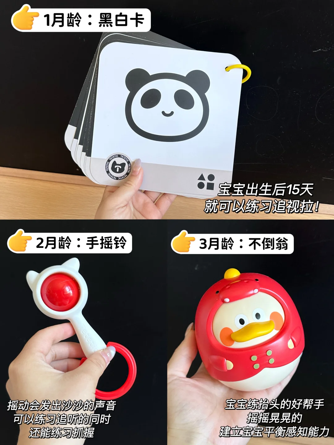 👉🏻0-3月龄: 黑白卡 +手摇铃+不倒翁