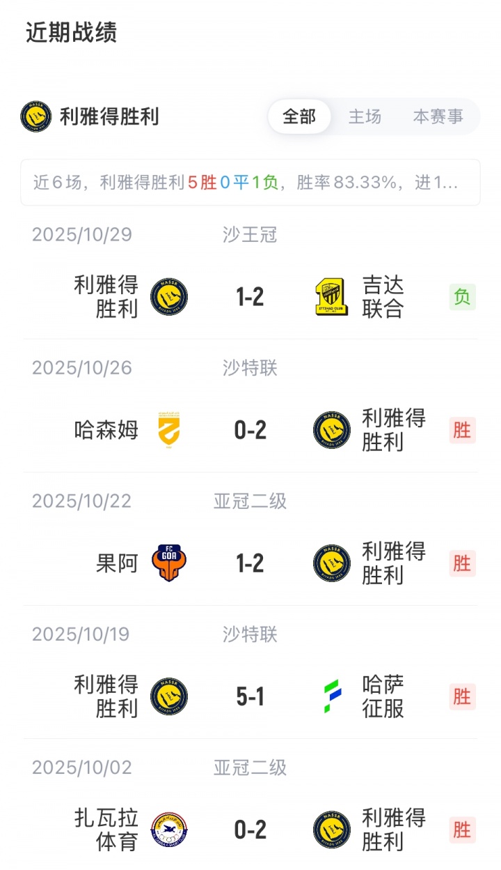 利雅得胜利首发:1-阿奇迪、2-哈纳姆、5-阿姆里、26-伊尼戈·马丁内斯、12-纳瓦夫、11-布罗佐维奇、20-安吉洛、79-菲利克斯、21-科曼、10-马内、7-C罗