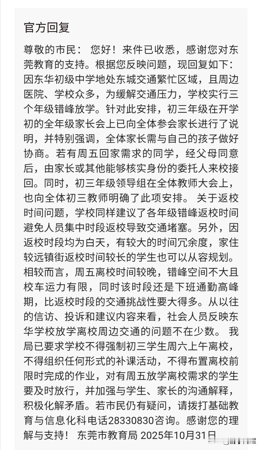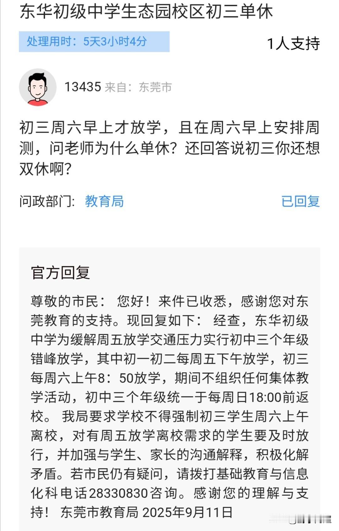 近日,有家长多次投诉东华初级中学生态园校区取消双休制,官方均作出了详细回复。 自今年开学起,便有人在问政平台频繁投诉东华生态园校区初三开学即取消双休。投诉内容大致为,学生在学校每天6点多起床学习,晚上快十点才下晚自习,休息时间不够,希望将单休改为双休。 官方回复一次比一次详尽。经调查,学校也有自身的考量。东华初中三个年级1.7万多名学生均在周五下午放学,为缓解当日交通压力,学校实行年级错峰放学,且安排较为灵活,并未强制要求。 家长自开学起就“东华初三无双休”问题投诉已有两个月,学校也给出了详尽解释,不妨予以理解下。