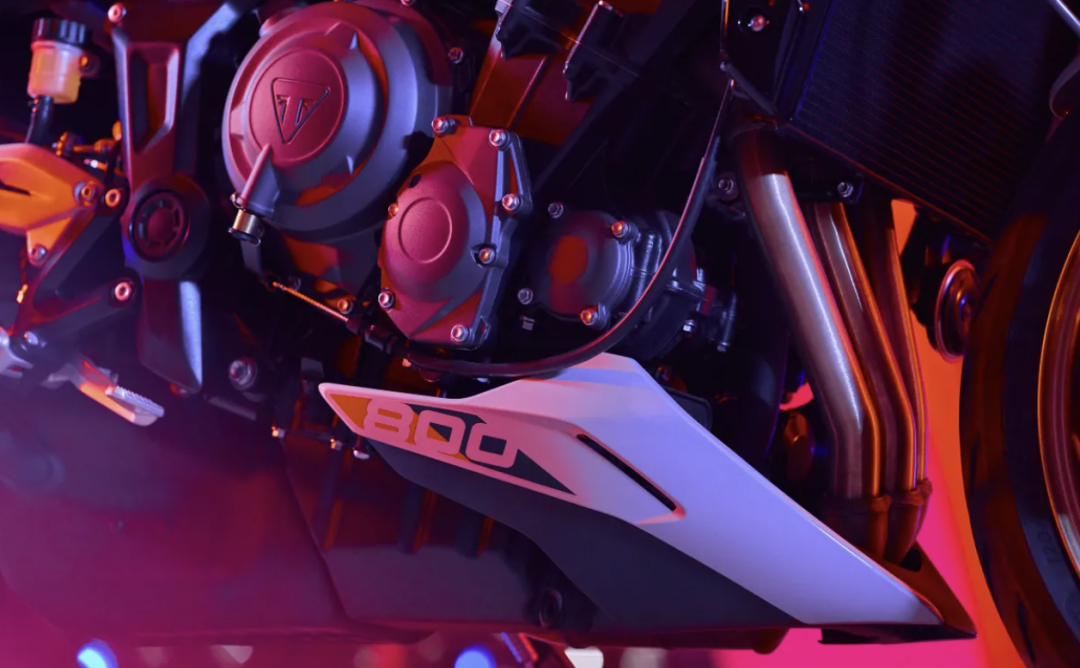 发动机搭载的是 Tiger Sport 800 的 798cc 同款发动机,并非 Trident 660 的扩缸版本。实际排量 798cc,采用三节气门体,不同于 Trident 660 的单节气门;最大马力达到 113hp/10,750rpm,扭力 91Nm,最高转速 11500rpm,相比 Trident 660,功率提升了约 40%。