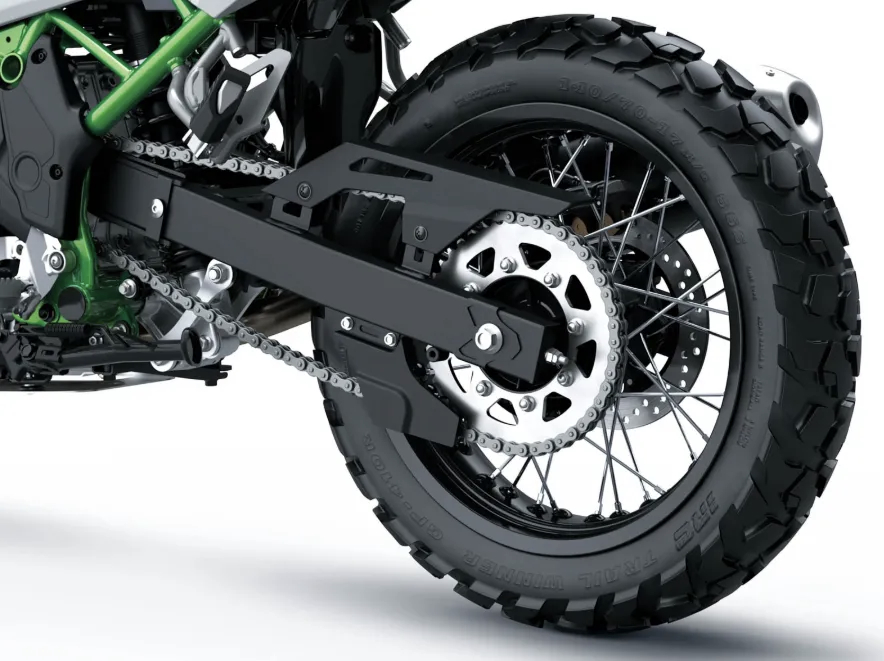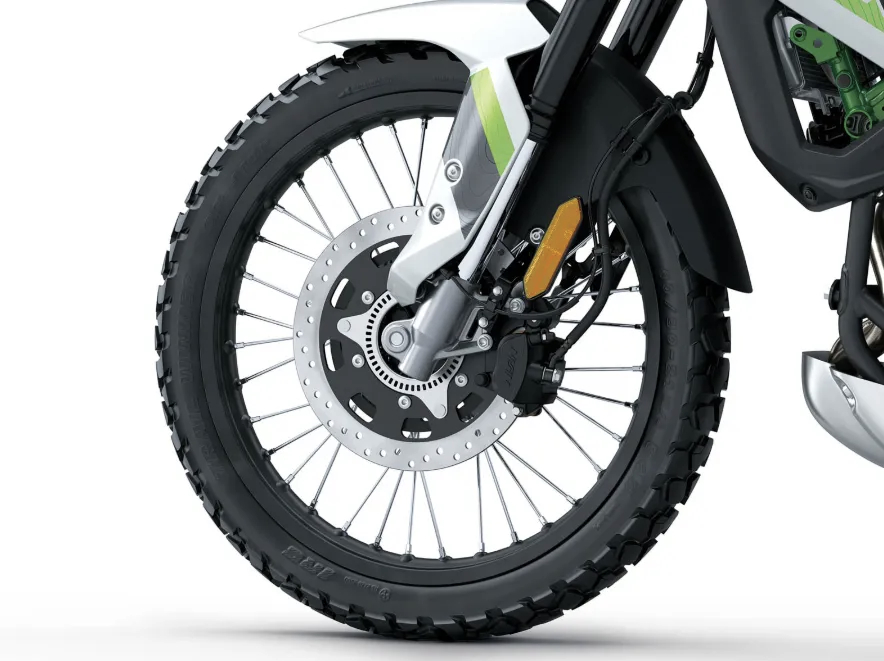 为应对复杂地形,KLE500的悬挂系统迎来全面升级。前轮采用KYB 43mm倒立式前叉,行程达210mm;后轮配备Uni-Trak多连杆中置减震,行程200mm。这一数据甚至接近专业越野车水平。搭配前21英寸、后17英寸的钢丝辐条轮毂,以及IRC品牌越野两用胎,可轻松碾过碎石、泥泞等障碍。刹车系统前轮采用300mm单碟配NISSIN卡钳,后轮为230mm单碟,标配ABS系统且可通过手把开关关闭,满足越野骑行需求。