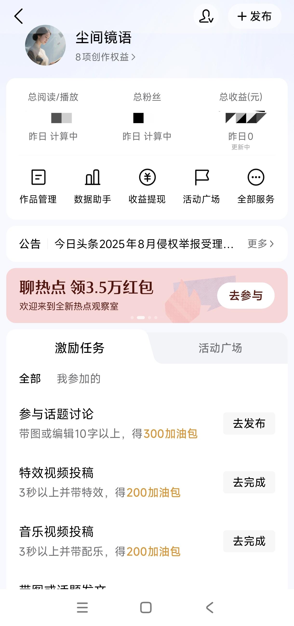 一觉醒来,打开头条吓了一跳:16个小时,1861展现,阅读量41。昨天还更奇葩,微头条发出去1小时了阅读量居然为0,感觉已经很久很久没这么低的数据了! 这让我很恐慌,难不成是这几天断更的原因?近期在忙别的事,疏忽了写头条,就二天一更,三天一更这样的,五六天才象征性更了两篇,看来还是不能断更啊。 我又不甘地查看其他条友的信息,发现好些人都在吐槽阅读量低这个问题,包括一些大咖在内,难道这不是个例?那么阅读数据都去了哪里呢?这也太不正常了吧。 我前几天更的那篇微头条更奇葩,展现量5万多点,阅读最却达到了2.5万,阅读比超过了50%。我当时还在想,管他展现上不上去,阅读量可以就行,谁知第二天一看收益,才2块多点点,一万阅读量还居然不到一块钱,现在真是让人欲哭无泪啊。 这要是放在以前妥妥的几十元啊。 要么没展现没阅读量,要么没展现有阅读量却没收益。这还有继续更下去的动力吗? 还有一个奇怪的现象,我发现以前写的文章在推了,我想是不是大家都在更微头条而忽略了图文,所以头条有意在引领大家更新图文。 感觉自今年8月28日新规以来,头条真的发生了翻天覆地的变化,一是单价大降且降了不只五倍,这令不少人开始断更;二是现在的阅读量真是没眼看,而没阅读意味着就没收益,整个收益就更加大幅下降,好些人每天收益一块两块,一毛两毛。 再有昨天我还发现账号界面突然发生了变化了,感觉非常不适应,增加了挣加油包等项目,感觉一下从大平台变成了普通小平台的模样,显得不那么高大上了,大家有没有这样的感觉呢? 其实头条一直是我最心仪的平台,也是我最挣钱的平台,相信很多人也挣了不少钱。但最近两三个月以来真的改制很多,让人猝不及防,但我还是不愿放弃。 因为头条让我也挣了不少的米米,为了这一份厚爱与信任,我还是愿意继续更下去,今天继续打起精神写,每天不断更。 大家怎么看,欢迎留言一起讨论吧。