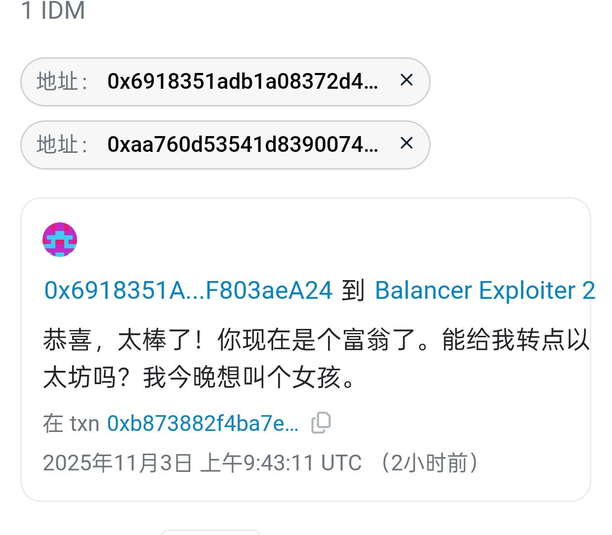 Balancer 被捅了!11月3日那天,1亿多美金被悄悄扫走,链上还有乞丐求黑客送钱 11月3日这天,Balancer V2 池彻底被捅了——链上数据显示,一开始估计被盗 7,000多万美元,后面合并统计最终指向 1.1–1.28 亿美元。简单说,就是有人发现了协议的漏洞,把钱扫了个干净。 别被群里那些“被 flashloan 租借搞坏池子”“社会工程”的嘴炮绕晕,这次很俗气:是合约逻辑没管好,访问控制漏洞 + Boosted Pools 的交互弱点,让攻击者做了本不该做的提款操作。通俗点,就是合约自己没拦住人家,钱就跑了。 链上还原现场挺血腥: 攻击在清晨到上午那段时间完成,多个池子的 osETH、WETH、wstETH 被连续提走。 初期统计约 6,800 个 osETH、6,587 个 WETH、4,260 个 wstETH 被搬运。攻击者边转边整合,明显有计划。 不只单一链受影响,ETH、Arbitrum、Optimism、Polygon 等多条链的 V2 都中招,这也是为什么损失从 7,000 万到 1.28 亿的数字不断刷新。 有意思的是,链上还出现了“奇观”:一些小钱包直接跟着攻击者交易,留言/备注里写着“黑客大佬,分点给我行不?”、“求点分红”,几乎像现实版的乞丐排队等施舍。你想想,链上真的有人在给黑客送锦旗式求助,这场景太荒诞。