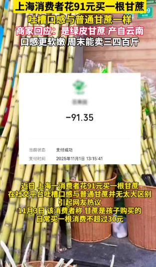 刷到这个新闻我直接惊掉下巴!在上海买一根甘蔗居然要91块钱?这价格够我在老家买一捆了吧!到底是遇到水果刺客,还是这根甘蔗藏着啥过人之处?今天咱们就来好好说道说道,保证让你看得明明白白! 事情是这样的,上海一位李先生最近吐槽,孩子在百果园买了根甘蔗,结账时91.35元的价格直接让他懵了。要知道,他以前买整根甘蔗最多也就30块,而且吃着感觉和普通甘蔗没啥区别。这波操作瞬间引发全网热议,不少网友直呼太贵了抢钱呢。 面对质疑,商家倒是很淡定,说这可不是普通甘蔗,是云南西双版纳来的绿皮品种,9.9元一斤,口感软嫩不扎嘴,还强调明码标价,周末都能卖三四百斤。这话一出,网友们分成了两派:有人觉得上海房租、人工贵,明码标价愿买愿卖没毛病;也有人晒出各地价格,成都7斤甘蔗15元,柳州 2根才5元,对比之下确实差距太大。 在我看来,明码标价是底线,但商家也得让消费者觉得 “贵得值”。要是光说 “品种特殊” 却没让人吃出口感差异,难免让人质疑溢价虚高。不过换个角度想,一线城市的运营成本摆在那,加上优质品种的种植、运输成本,价格高一些也能理解,关键是要把价值说清楚。 其实这事儿也给咱们提了个醒:买东西前多留意单价和预估总价,遇到不熟悉的品种多问一句,避免意外 “被刺”。而商家想要让大家接受高价,就得把品质优势实实在在展现出来,这样才能赢得信任。 一根甘蔗引发的热议,说到底是大家对合理消费的关注。只要定价透明、物有所值,哪怕贵一点也有人买;但要是只靠噱头溢价,迟早会失去消费者
