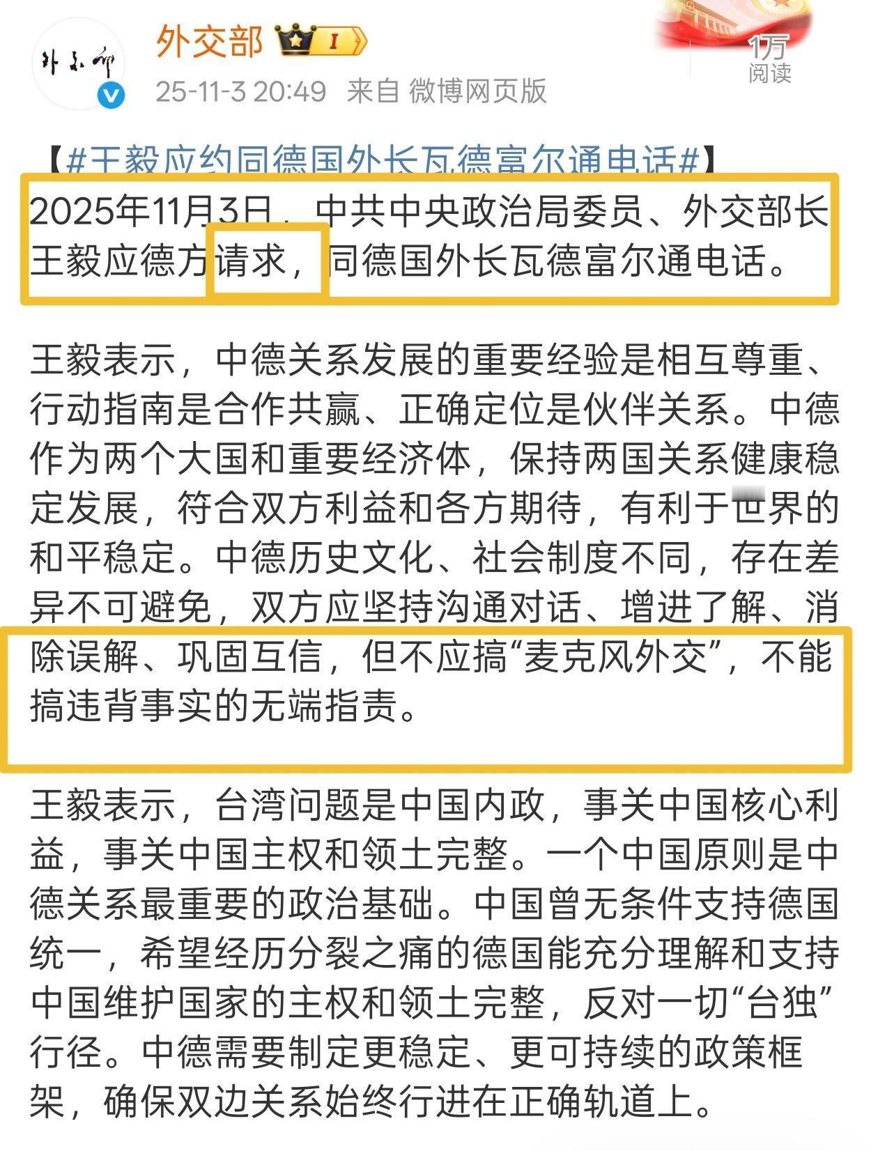 法国国际广播电台今天(11月4日)报道:“德国外长与中国外长王毅通话,将重启访华行程。德国外交部发言人表示,德国外长瓦德富尔与中国外交部长王毅通话,双方就安全、经贸及共同关心的议题交换意见,并同意尽快重启先前取消的访华行程。” 只能说德国外长瓦德富尔这波操作也算把 “搬起石头砸自己的脚” 演得明明白白,所谓的 “台湾牌” 压根没当成筹码,反倒把自己逼进了被动的死胡同,最后只能乖乖低头,这从 “应德方请求” 四个字里就能把尴尬味儿闻得清清楚楚。 要是往前倒腾半个多月,瓦德富尔可不是这副模样。当时他正兴冲冲筹备上任后的首次正式访华,随行名单里特意带上了德国汽车工业协会的人,算盘打得叮当响 —— 既要谈关键矿产、稀土和半导体的供应链稳定。 毕竟德国新能源汽车和半导体产业 90% 以上的稀土都得从中国来,工厂能不能开工全看这口气顺不顺,又想在印太事务上摆摆姿态,给盟友和选民演一出 “不软弱” 的戏码,典型的想 “拿利求信” 两头占便宜。 可他偏要在访华前踩红线,嘴上说着 “坚持一中政策”,转头就加了句 “具体实施由德国自行决定”,还扯什么 “台湾海峡航运自由对世界繁荣至关重要”,明摆着是给 “台独” 势力留缝儿,这哪是访华前的铺垫,分明是揣着明白装糊涂想玩擦边球。 中方当然不吃这一套,当即就戳破了他的小九九,直言只提 “维护现状” 不提反对 “台独”,实质就是纵容分裂势力。 结果呢?原定启程前 48 小时,德国突然宣布行程推迟,理由说得冠冕堂皇 “未能安排足够会谈”,可明眼人都知道,这是中方用行动告诉他:核心利益碰不得,没诚意就别来。 这一下瓦德富尔算是慌了神,不仅自己的访华计划黄了,连带着德国总理默茨年底访华的 “铺路” 任务也砸了,英国《金融时报》都直接骂这是 “超级外交灾难”。 更让他坐不住的是德国国内的经济烂摊子。2025 年前 8 个月,中德贸易额已经冲到 1634 亿欧元,中国重新夺回德国最大贸易伙伴的位置,比美国还多了 6 亿欧元。 德国汽车业更是离不了中国市场,大众、宝马在华销量占比都超过三分之一,那些车企高管早就等着瓦德富尔去谈第四季度的稀土临时配额,结果行程一黄,不少人私下骂他 “拿企业利益当政治筹码”。 偏偏这时候美国还在背后捅刀子,对欧盟输美商品加征 15% 关税,德国对美出口连续 5 个月下滑,8 月份更是暴跌 23.5%,汽车、机械这些核心产业被打得抬不起头,博世、西门子都在裁员,企业破产数量创 12 年来新高,经济增长预期只有 0.2%,这节骨眼上要是丢了中国市场,德国工业真得喝西北风。 内外压力挤在一起,瓦德富尔再也端不住架子了,只能主动找上门来 “请求” 通话。这时候他哪还敢提什么 “自行决定”,乖乖把 “坚持一个中国原则” 说得明明白白,毕竟再嘴硬下去,别说自己访华没戏,默茨的行程也得泡汤,国内的工商界和执政联盟里的盟友也得把他喷死。 之前他还跟着美国喊 “应对中俄威胁”,现在却得放低姿态求对话,这种反差简直没眼看。 其实这事儿早有前车之鉴,想和中国打交道又想在核心利益上耍小聪明的,从来没占到过便宜。瓦德富尔大概是没搞清楚,中国现在根本不吃 “又要好处又摆姿态” 那一套,稀土供应、市场份额这些实实在在的利益,从来都是和尊重主权绑在一起的。 他这趟从 “揣着筹码” 到 “主动请求” 的转变,说白了就是给自己的傲慢交了学费,也让其他想玩类似把戏的国家看明白:台湾牌根本不好使,反而会把自己逼得下不来台,与其搞这些小动作,不如好好坐下来谈合作实在。 毕竟德国工厂的机器转不转,汽车能不能卖出去,最终还是得看有没有诚意和中国好好相处,耍小聪明的结果只能是自讨没趣。