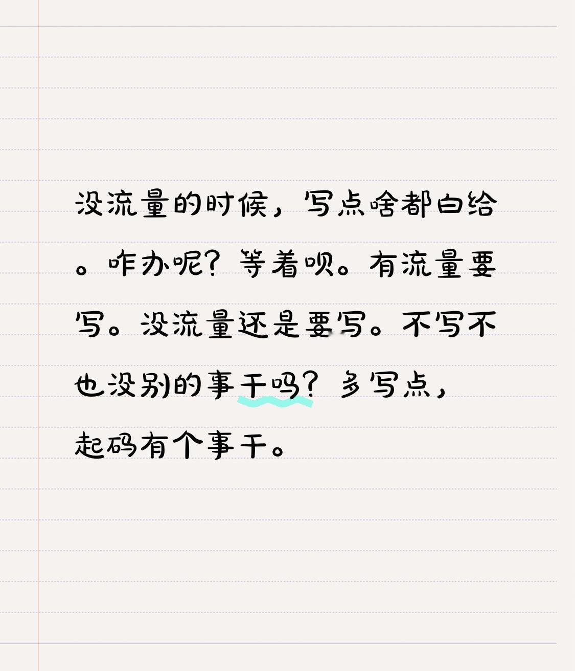 没流量的时候,写点啥都白给。 咋办呢? 等着呗。 有流量要写。 没流量还是要写。 不写不也没别的事干嘛? 多写点,起码有个事干。