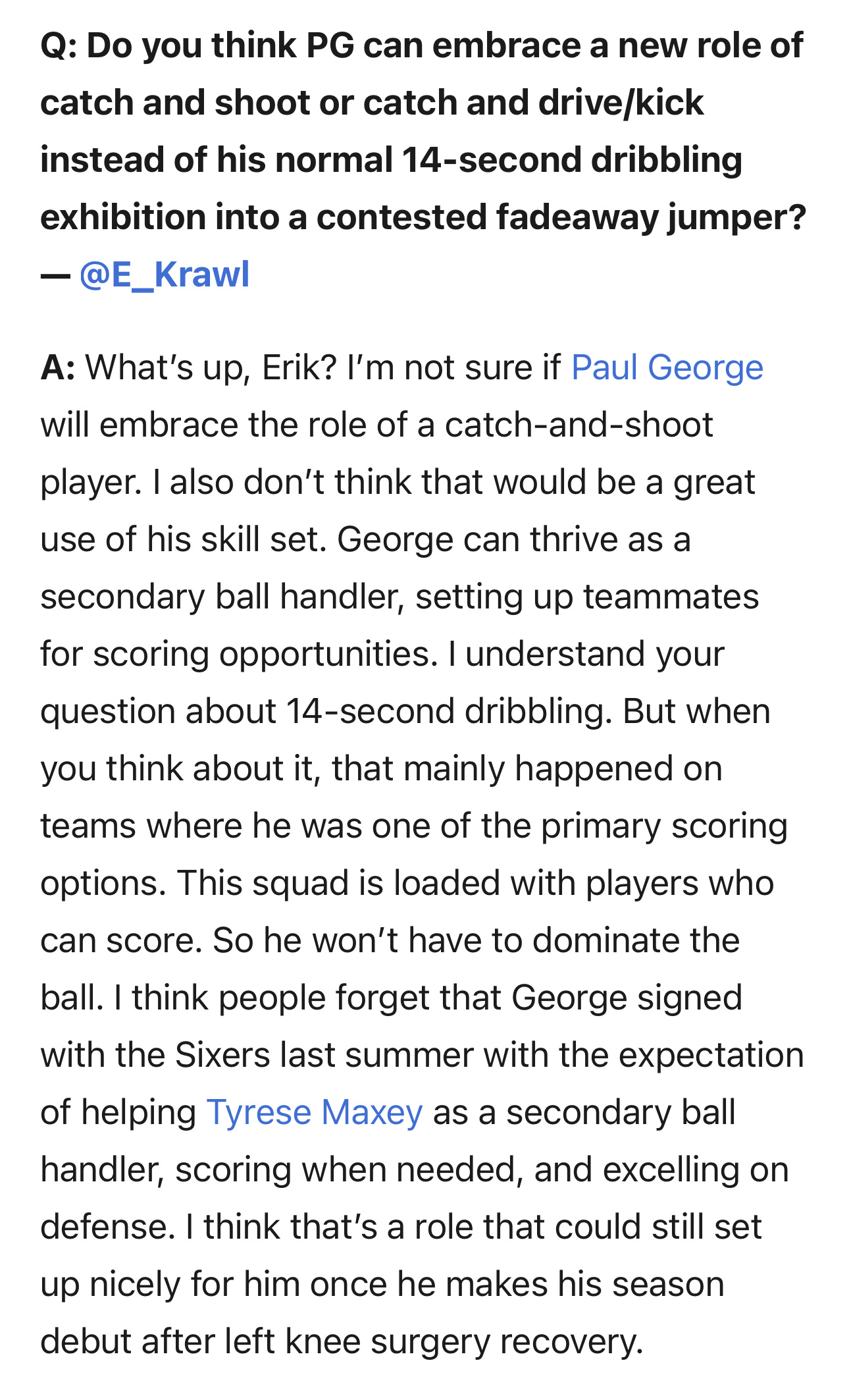 记者答:你好,球迷。我不确定保罗·乔治能否接受接球投篮的角色。而且我觉得那样做也不太能发挥他的技术特点优势。乔治更适合作为第二持球人,为队友创造得分机会。我理解你对他长时间运球的质疑。但细想之下,这种情况主要发生在他作为球队主攻手的时期。如今这支球队得分点众多,所以他不需要过多地控球(无需大包大揽)。我觉得大家可能忘了,乔治去年夏天加盟76人时,球队就期望他能作为承担辅助泰雷斯·马克西的第二持球人角色,在需要的时候得分,并在防守端有所贡献,同时减轻主控压力。我认为,在他左膝手术康复后重返赛场,这个角色或许仍然适合他。