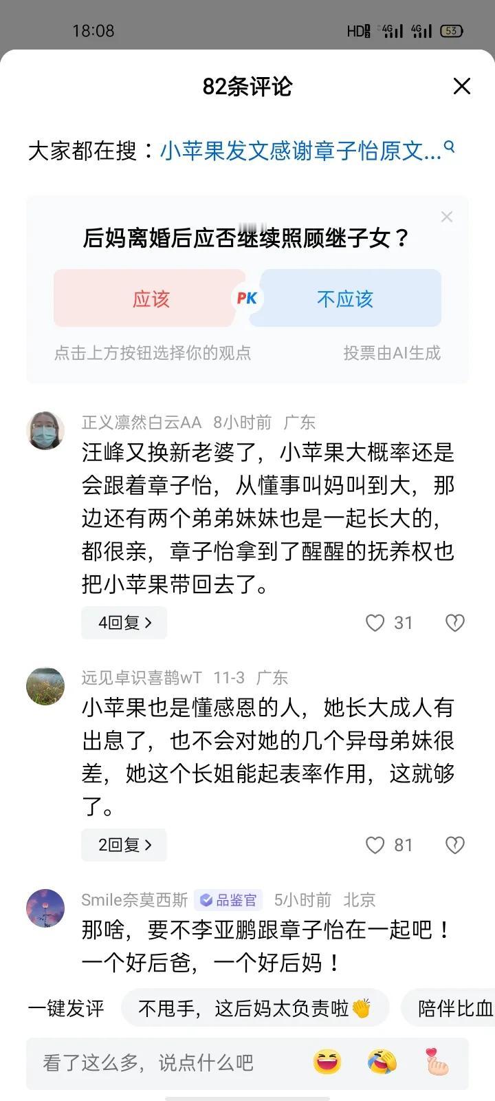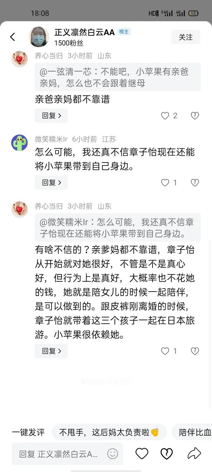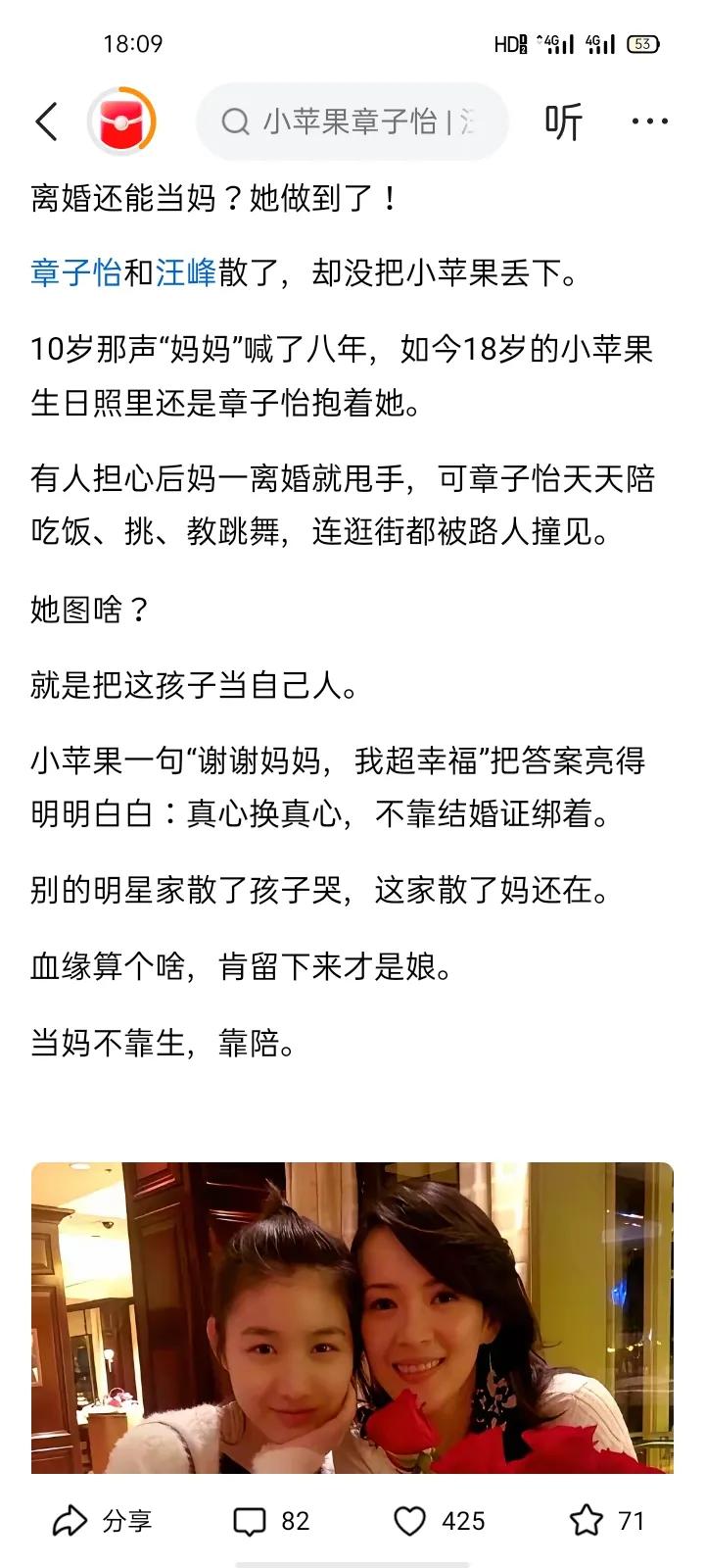 章子怡这后妈当的不赖!小苹果的亲爹亲妈都不太靠谱。八岁开始章子怡接手经管这个孩子。养的肉眼可见的不错! 孩子这声妈妈没有白叫!懂得感恩。都是性情中人。 亲爹妈都不靠谱,章子怡从开始就对她很好,不管是不是真心好,但行为上是真好,大概率也不花她的钱,她就是陪女儿的时候一起陪伴,是可以做到的。 跟皮裤刚离婚的时候,章子怡就带着这三个孩子一起在日本旅游。小苹果很依赖她。 同样大度的还有张纪中,老婆试管整个外国孩子,也抚养的很好。 其实能做到不离不弃,已经很难得。有多少亲妈都做不到那么好。 皮裤又换新老婆了。孩子想跟爸爸亲近,还需要接手新后妈,没有必要了。重新接手一个后妈,比新谈个恋爱都费心思。 有网友乱点鸳鸯谱,说李亚鹏是好后爸,章子怡是好后妈,他俩在一起吧!可千万别,各自安好吧!娱乐圈这么转圈的话,这关系太难缕清了![捂脸] 窦唯窦颖亚鹏王菲霆锋亚东瞿颖还有谁,补充一下啊[大笑]