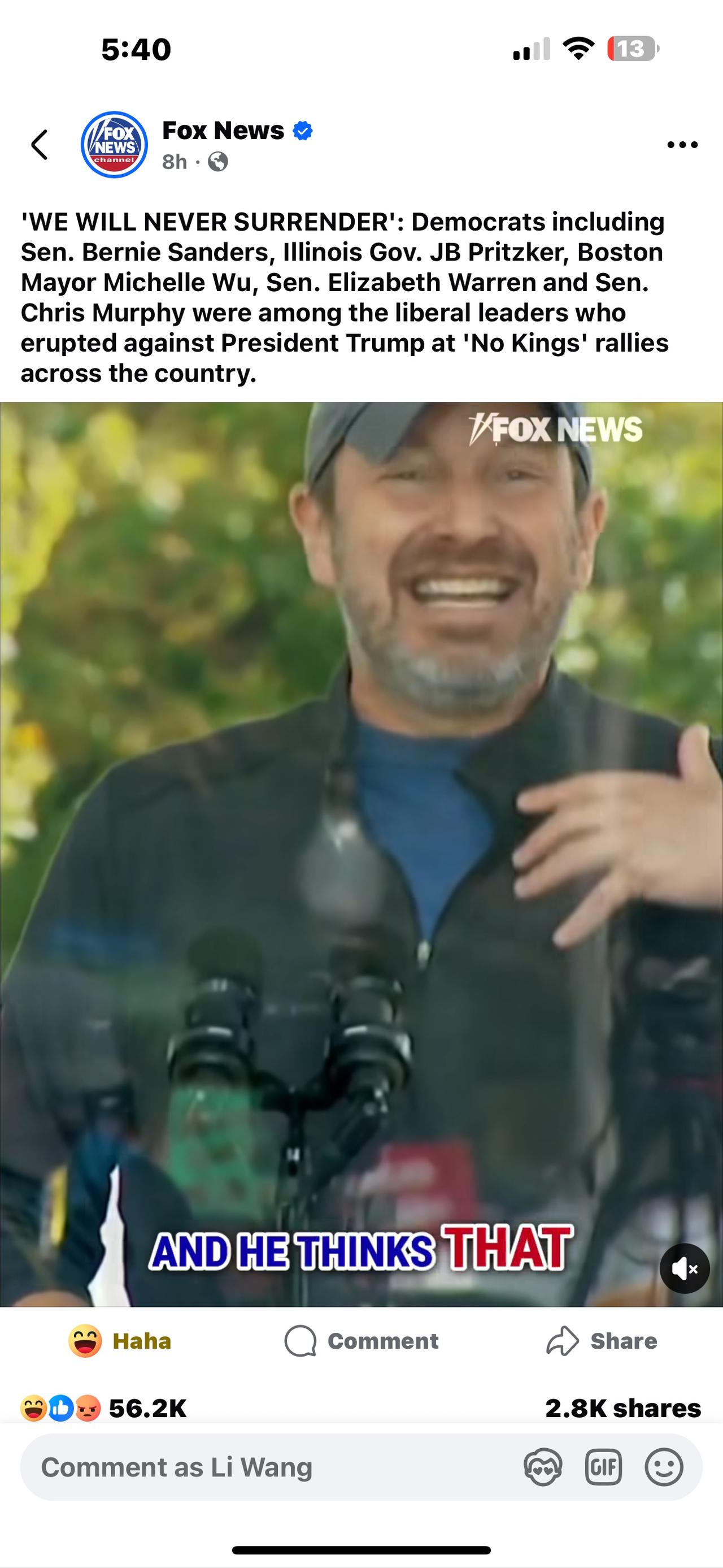 福克斯新闻:民主党自由派领袖说我们不投降😱 “我们永远不会投降”:包括参议员伯尼·桑德斯、伊利诺伊州州长 JB 普利兹克、波士顿市长米歇尔·吴、参议员伊丽莎白·沃伦和参议员克里斯·墨菲在内的民主党人都是在全国各地的“反对国王”集会上反对特朗普总统的自由派领导人之一。 网友们跟帖:嘿,今天成功了,我们没有国王,但还有特朗普总统——耶 波士顿极左民主党市长是华裔二代。土生土长的美国香蕉华人。(外黄色内白色)