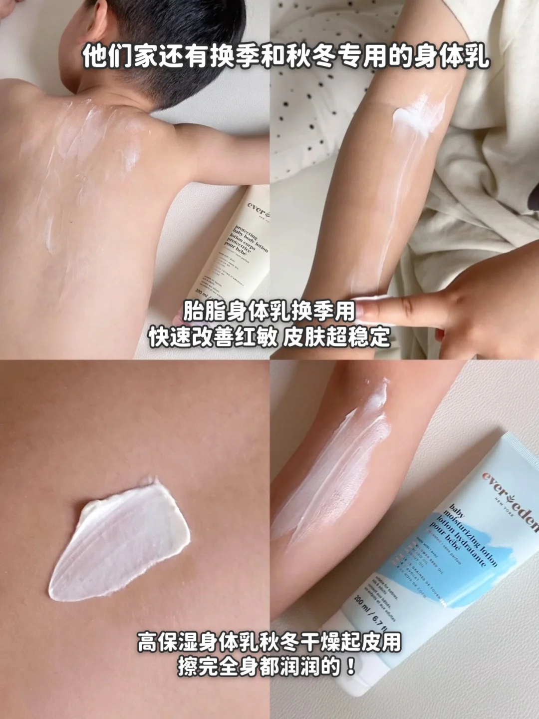 除了夏天用EE小蓝乳之外,换季肌肤不适的时候,我就给娃厚涂EE胎脂身体乳,皮肤很快就稳定下来了