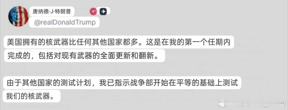 特朗普再次重申:已指示“战争部”开始以平等的方式进行核武器试验。