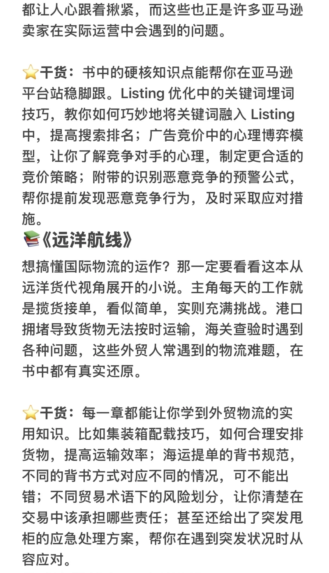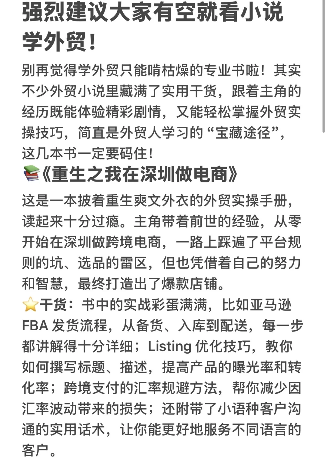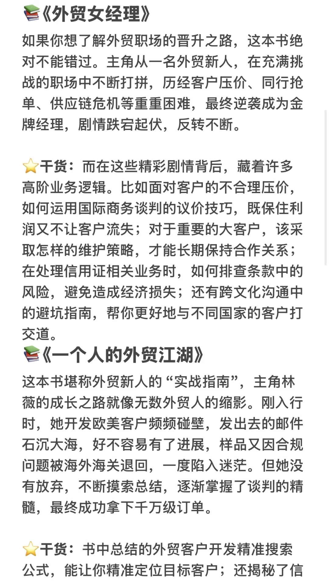 别再觉得学外贸只能啃枯燥的专业书啦! 其实不少外贸小说里藏满了实用干货,跟着主角的经历既能体验精彩剧情,又能轻松掌握外贸实操技巧,简直是外贸人学习的 “宝藏途径”,这几本书一定要码住!