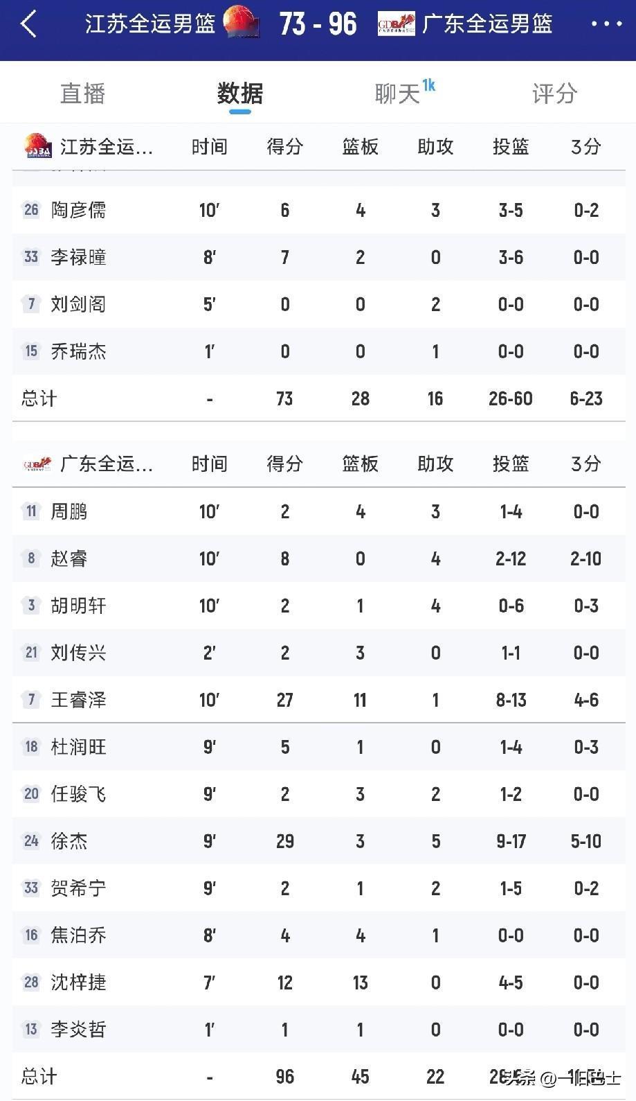 还有人说徐杰不如赵继伟吗?[得意] 全运会男篮比赛,广东队96-73江苏队,广东队半场居然落后江苏队7分?第三节比赛广东队徐杰站出来了,个人内突外投,拿下11分带领广东队取下比赛胜利。 在全运会广东男篮独一档的实力中,后卫线上的黑白矮实力更是国家队核心级,赵睿国家队队长,胡明轩前国家队队长,反观徐杰国家队落选球员,本场比赛却打出了拯救广东队的水平,队内竞争赢得一场。试问一下赵继伟什么时候能战胜过胡明轩和赵睿?