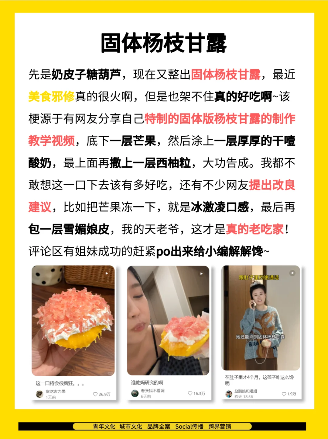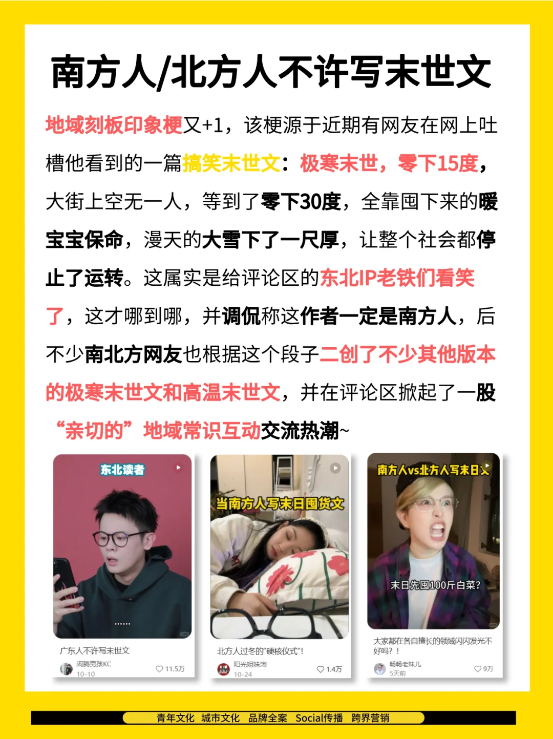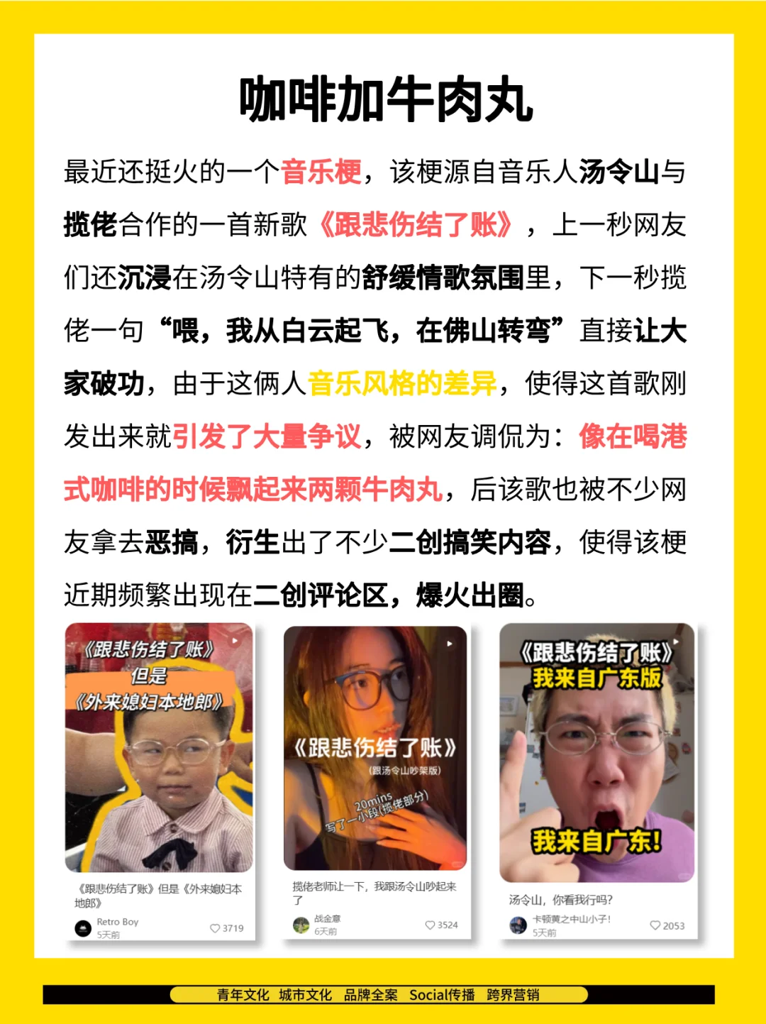 🔎年轻人最近在关注什么? 热词热梗指南,带你走进年轻人的世界! 🔥听完汤令山和揽佬的新歌belike:「咖啡加牛肉丸」; 🔥「固体杨枝甘露」,快🔥「南方人/北方人不许写末世文」,那南北混血的怎么办; *图源网络 每周关注快活Lab工作室,后面会持续更新更多营销案例、行业研究、青年洞察等相关内容干货哦!
