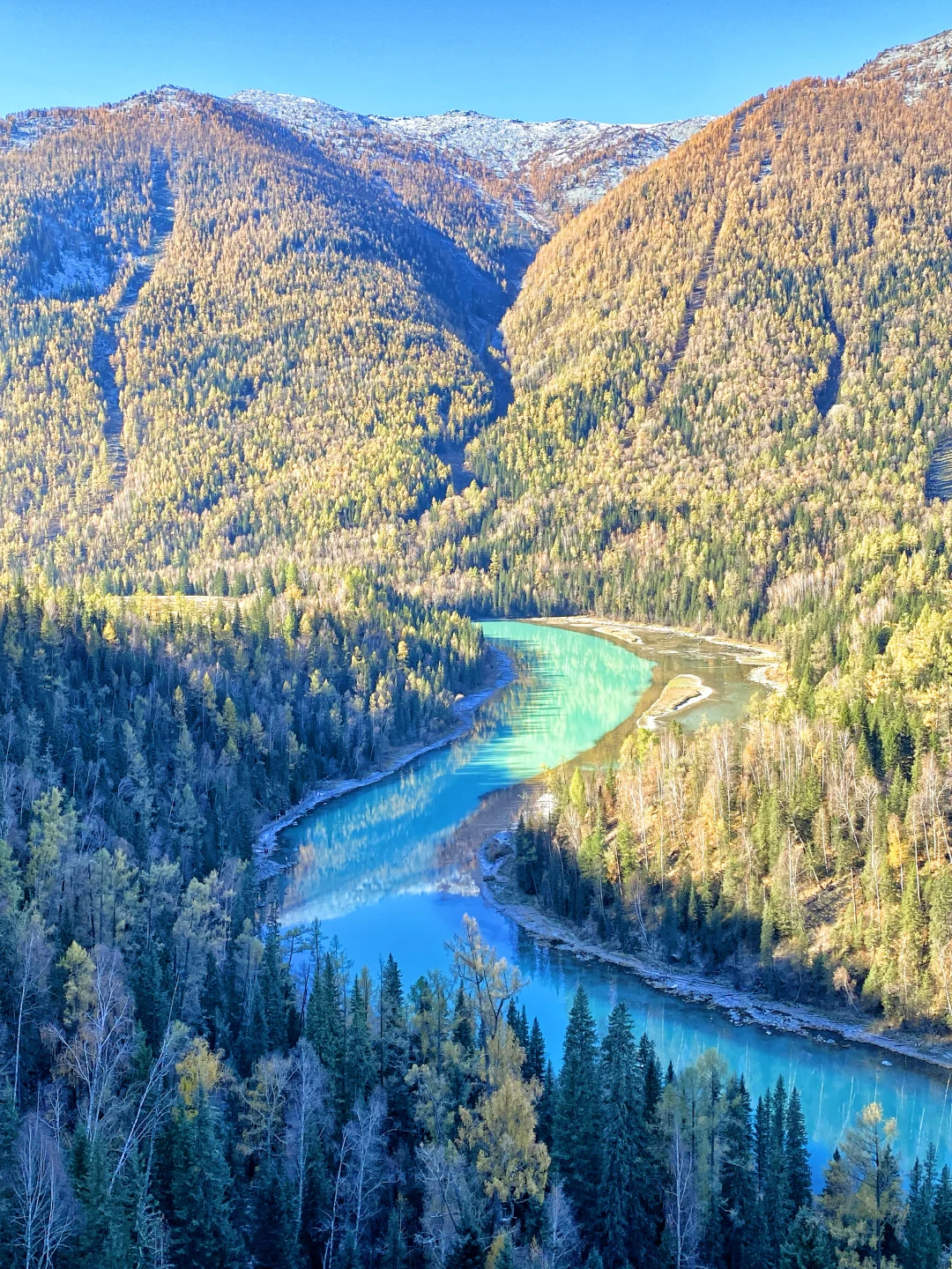 2. 月亮湾:标志性S弯! 喀纳斯的明信片角度,河道划出优美的弧线,像一弯月亮