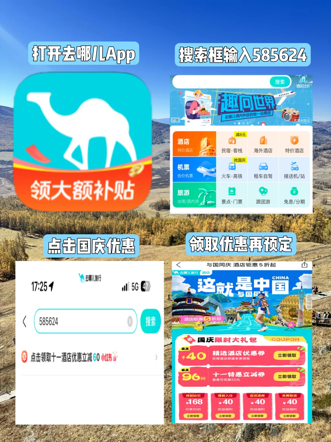 1、去哪儿网旅行App首页搜索栏输入“585624”