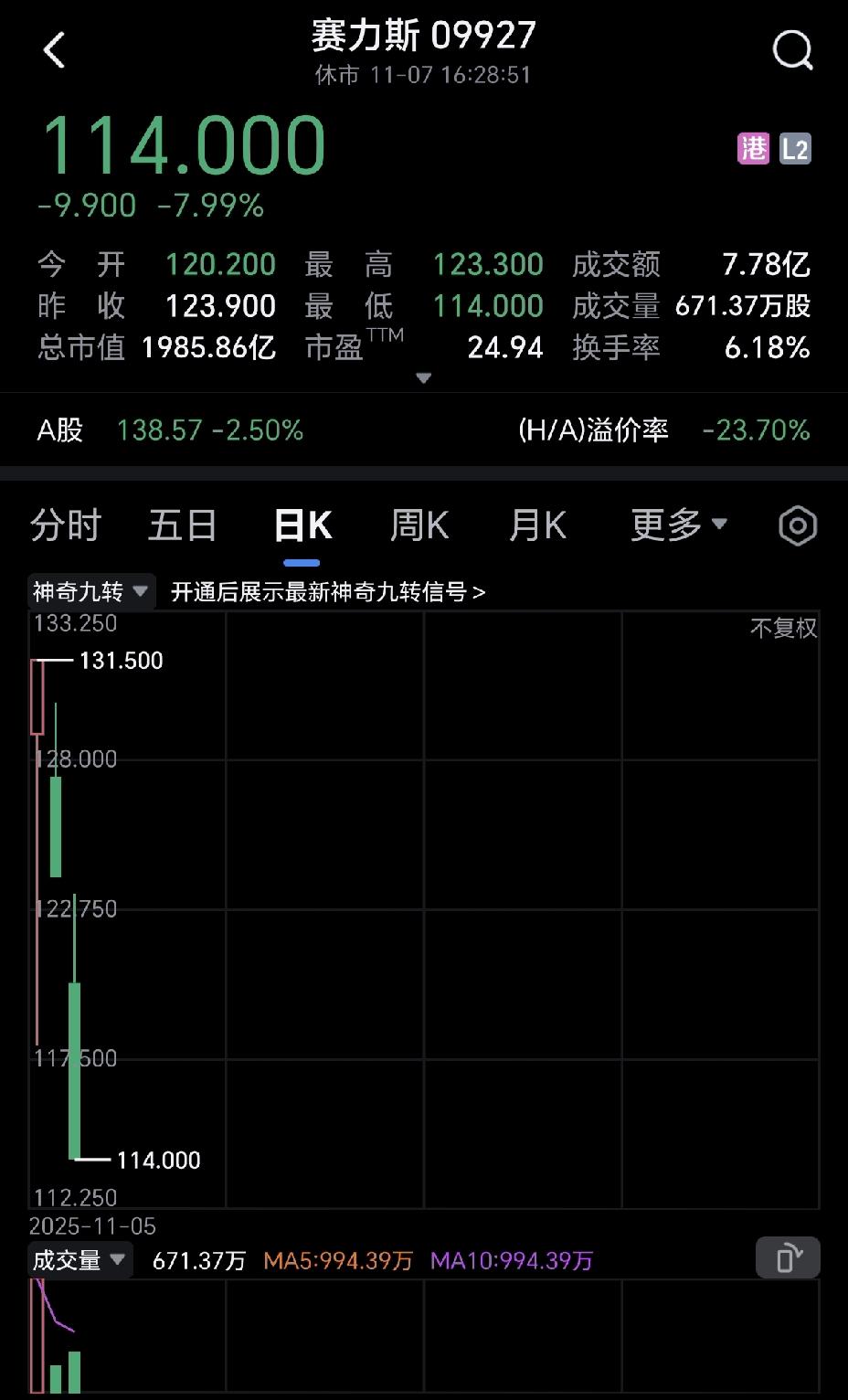说真的,这几天的赛力斯股价跌的惨不忍睹,我有理由相信,赛力斯被恶意做空了。 业绩不错的赛力斯,港股刚上市,本来是利好,结果成了利空,这股价跌的,散户叫苦不堪,这两天我一个朋友死的心都有了。 有网友也在问,赛力斯何时才能止跌?从目前的形势下,想止跌还很有难度,因为下周赛力斯必然会破了136.54元。 大家对此怎么看?
