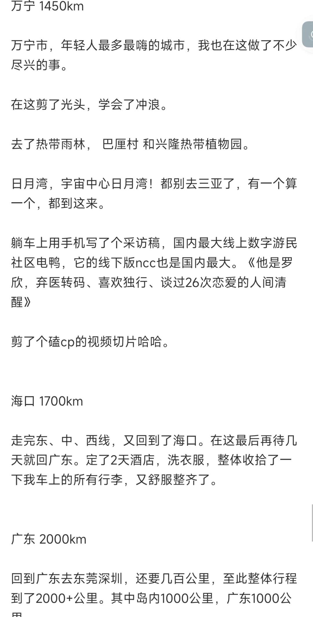 自驾海南,1个月2000公里,分享其中6个城市 10月1日出发,刚好一个月,走遍了海南东线、中线和西线几乎每一个主要城市。如此丰富的经历,必然是有不少见闻和感受的。摘取其中一些,作为我的海岛日记~ - 【目录】 东莞 0km 湛江 650km 海口 700km 琼中 850km 三亚 1000km 东方市 1150km 万宁 1450km 海口 1700km 广东 2000km - 东莞 0km - 去年自驾去了西藏的高原雪山,今年环岛自驾海南的热带雨林和大海。东莞距离三亚天涯海角1000公里,出发~ - 路上整体的状态,是走走停停,碎片化地前进和休息。前700公里是穿越广东沿海城市,高速和公路交替感受。 - 湛江 650km - 从湛江徐闻港,轮渡进海南。在湛江,来了个惬意的露营下午,买了吃的喝的,架起露营桌椅,煮起来~ 我停的是一个海边废弃的棚子,还路过个黑野猫,和我作伴。挠它还咕噜咕噜,吃不完的三文鱼还会埋在草丛里,时不时翻出来吃几口。 - 农村生活节奏是慢的,渔民网了一下午鱼,猫躺了一下午,我呆了一下午哈哈。撸会儿猫继续出发。 - 海口 700km - 在海口的一天,主要做了两件事,白天在万绿公园驻车休息一天,晚上吃了个和富贵海鲜自助火锅。 - 万绿公园是我无意间路过的,这恰巧也是本地人和游客最热门公园。海边、热带树林、音乐节,汇在一起就是万绿公园哈哈。我很喜欢在公园停车场驻车一天,以及去商场或夜市吃东西。不喜欢纯景区纯人文,喜欢居民扎根聚集的生活气。 - 拿个马扎穿拖鞋坐马路边消食。旅游的终点,就是像当地人一样生活哈哈。全国我都走遍了,一般我都当到家了,去核心商场吃麦当劳或火锅,逛公园和夜市。坐路边排挡或马路牙子。感受一个城市,最好的景致就是散步经过或吃饭闲聊的当地居民。 - 琼中 850km - 去三亚走中线,就是为了领略热带雨林。为了深入城市,一半在走公路,特意进入了屯昌县、琼中黎族苗族自治县。 白天夜晚穿越热带雨林还是挺神奇的,之前西藏巨大的山脉,以及贵州广西喀斯特地貌笔状山自驾也很神奇。 - 三亚 1000km … - 【超字数了,剩余内容截图放图片区了】 【超字数了,剩余内容截图放图片区了】 【超字数了,剩余内容截图放图片区了】 - 以上,便是我的海岛日记。我喜欢像徐霞客一样,走遍全世界。像科幻电视剧西部世界里的老威廉,骑马跑地图。就让我一直活在和死在路上吧~