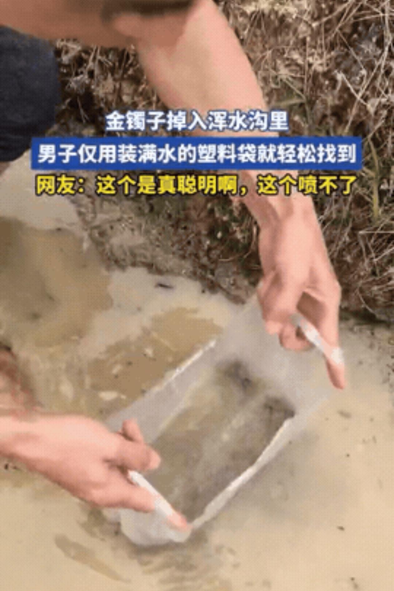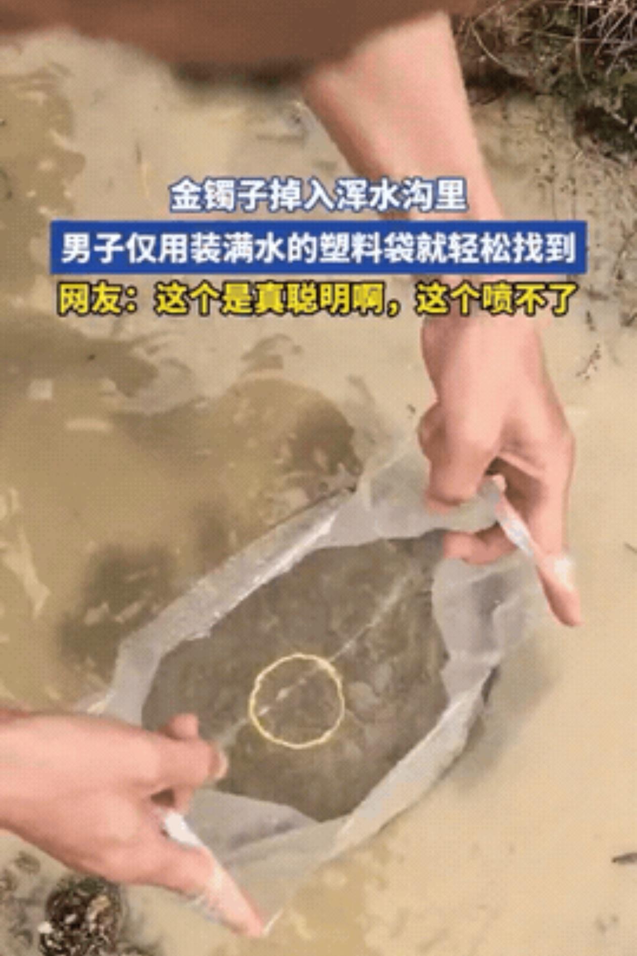 太有头脑了!福建一男子金手镯不小心掉进浑水沟,急得他直接伸手去摸。 水沟里全是泥浆,黑乎乎的根本看不见底,他在泥水里摸索了半天,指甲缝里全是泥。 正当他着急的时候,突然灵机一动,转身跑回家拿了个塑料袋。邻居都好奇他要做什么,只见他往袋子里装满清水。 他把水袋轻轻按进浑水沟,神奇的事情发生了——沟底突然变得清晰可见,连小石子都看得清清楚楚。 刚移动了两次,就发现泥缝里闪着金光,伸手一捞,金镯子就找到了。整个过程不到五秒钟,比刚才瞎摸强多了。 这个视频发上网后,网友们都夸他聪明。有人说这办法真绝,比买探测仪还管用。 其实原理很简单,就像咱们玩的放大镜。清水袋把浑水隔开,光线就能照到沟底了。 生活中这种土办法还真不少。记得我奶奶找掉进缝里的针,就用面团粘在筷子上,一粘一个准。 现在人遇到问题总想着买工具,反而把老祖宗的智慧忘了。手机掉沙发缝就要买探测仪,钥匙锁屋里就叫开锁公司。 不过这清水袋的法子只适合浅水,要是掉进深水潭就得想别的办法了。但不管怎么说,这大哥的急智确实让人佩服。 下次遇到类似情况,咱们也可以试试这招。当然最重要的还是把首饰戴牢固,省得这么麻烦。 你们觉得这个办法怎么样?要是你们会怎么做呢?