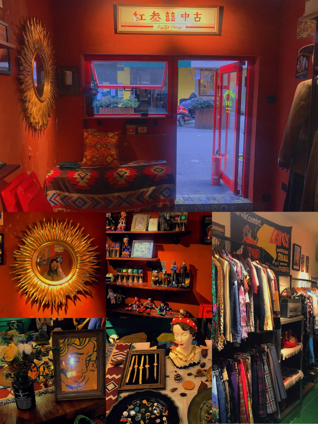 这是一家美式复古风的古着:门头是耀眼的红色,店内主色系是复古红,搭配绿色瓷砖,很有感觉~主要售卖古着服饰(内有试衣间)
