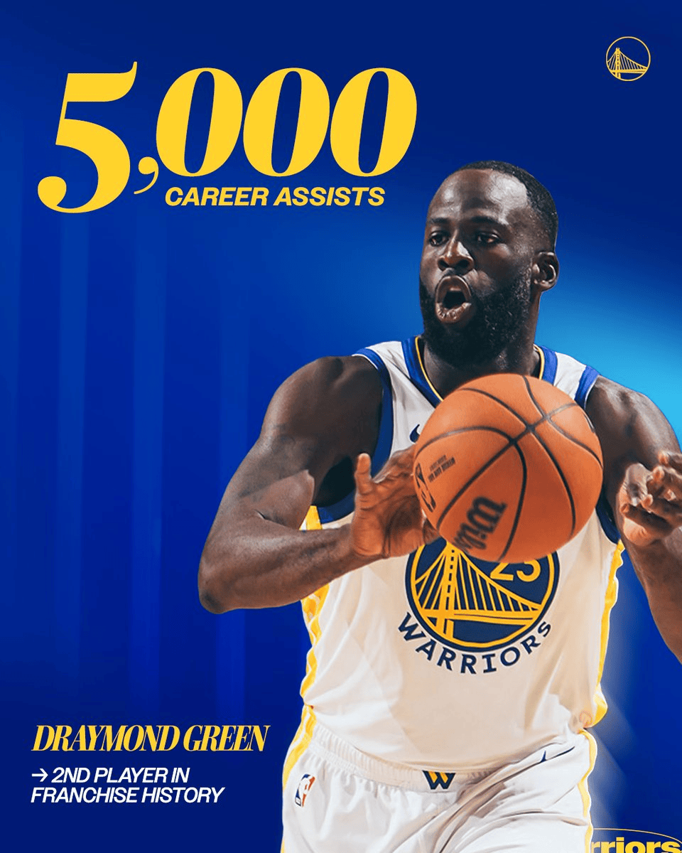 随后,勇士官方社媒更新动态,晒照祝贺格林成为勇士队史第2位送出5000次助攻的球员。