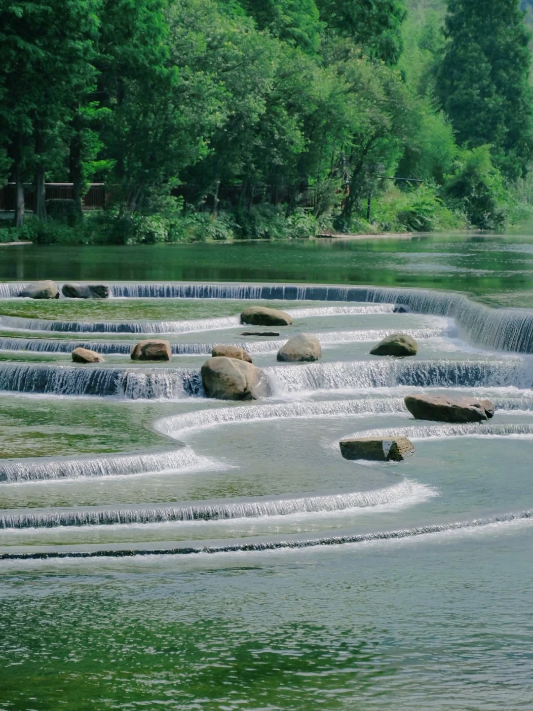 溪水很清澈,溪流顺着鱼鳞一样的台阶往下流