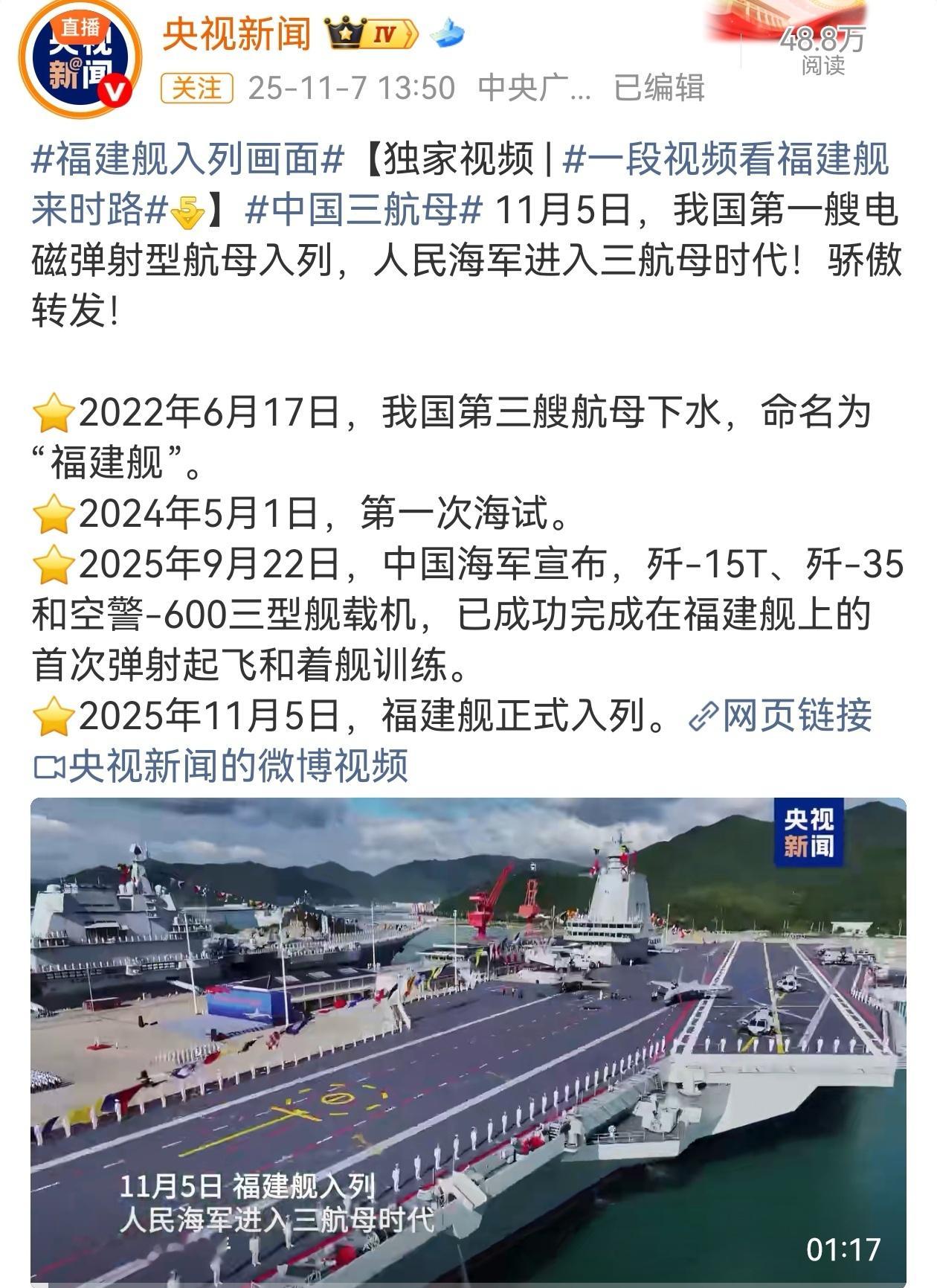 11月5日,福建舰正式官宣入列,不仅标志着中国海军迈入“三航母”时代,更开启了中