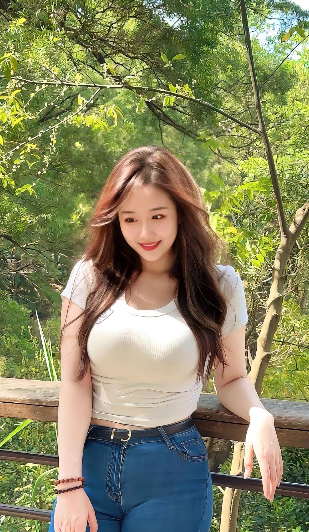 阳光下的清新少女,绿意盎然的背景,微笑的甜美瞬间。
