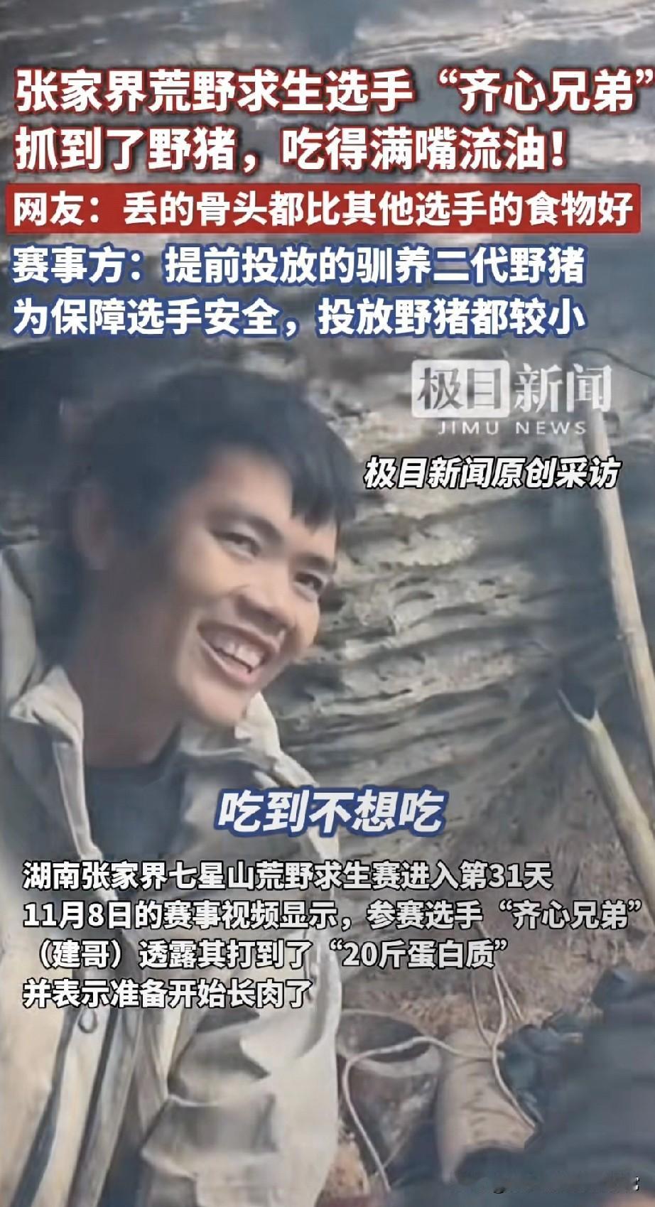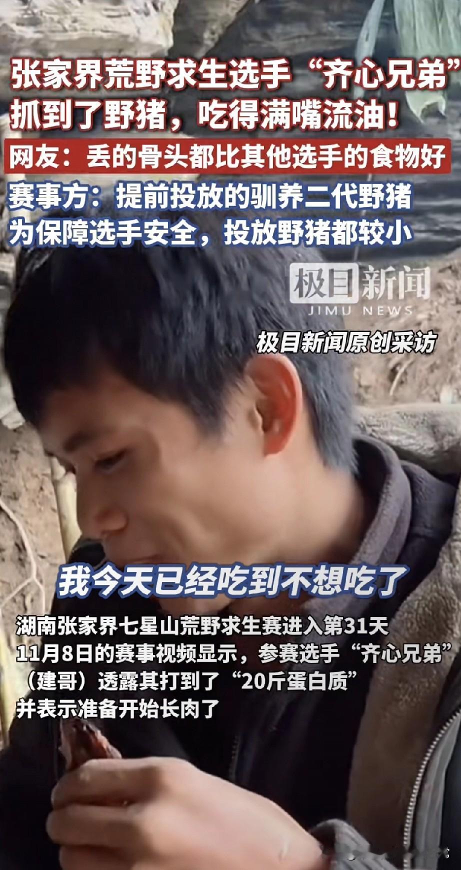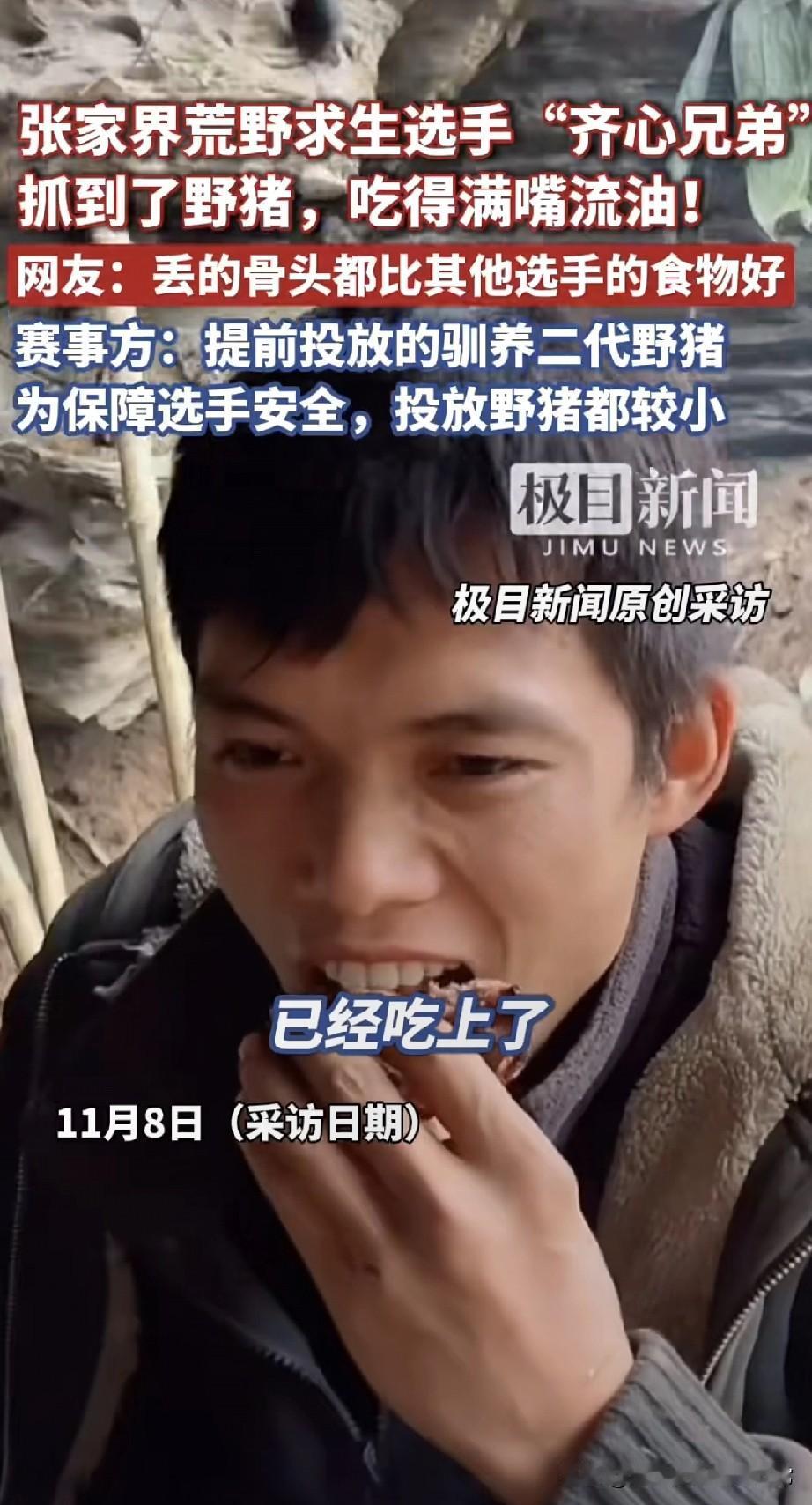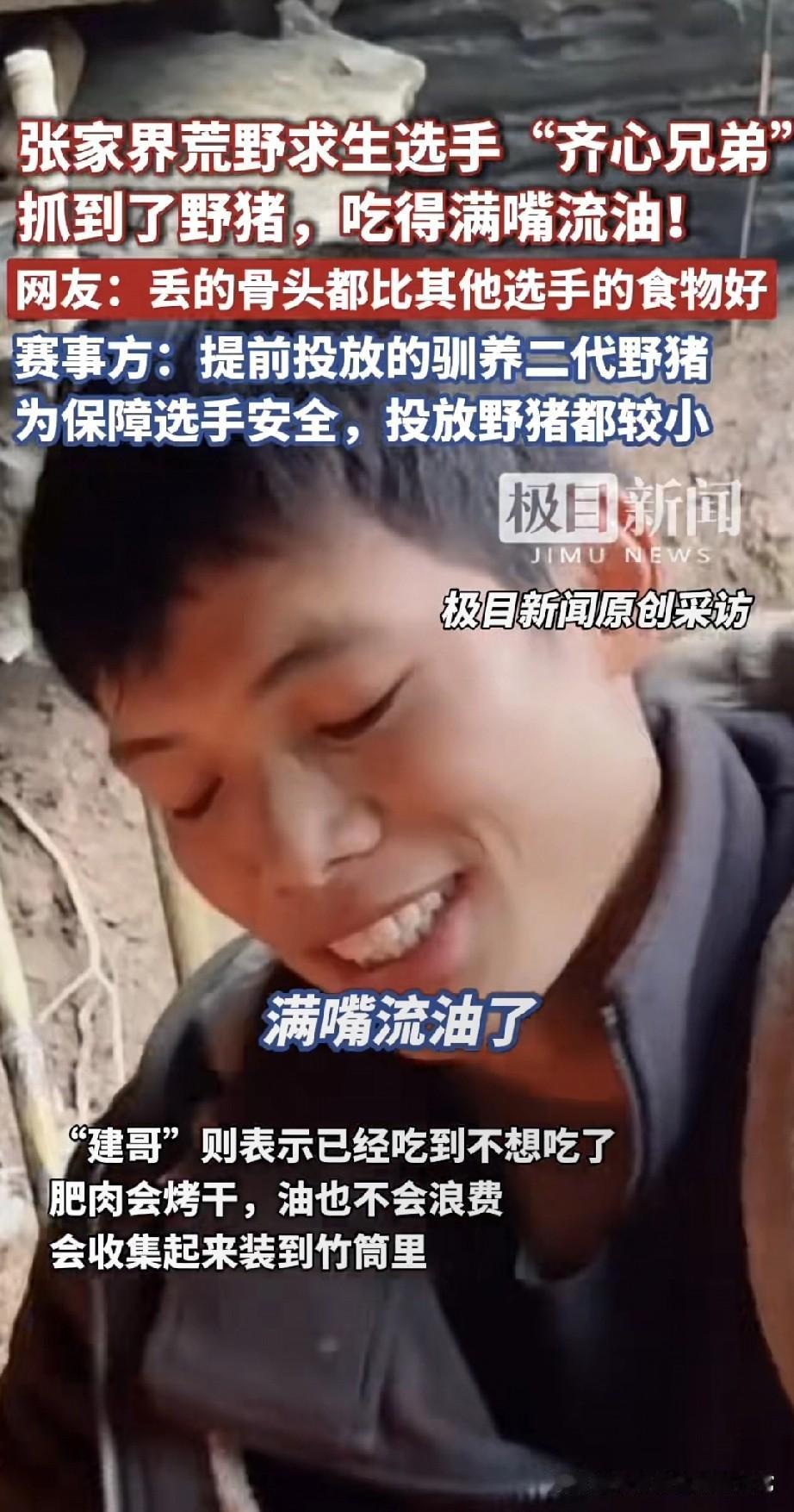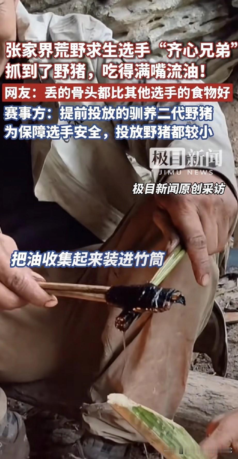 荒野求生选手烤20斤野猪肉吃到腻,网友骂剧本都写不出这爽感 谁看了不说句“这哪是求生,分明是开小灶”? 张家界七星山荒野赛里,“齐心兄弟”直接烤上了野猪肉——油顺着嘴角往下淌,还嘚瑟“今天吃到不想吃”,连烤出来的油都拿竹筒收着。 别的选手还在挖野菜啃树皮,他俩啃着20斤“蛋白质”,网友酸疯了:“丢的骨头都比我午饭强!” 赛事方赶紧出来圆:“是提前放的驯养小野猪,为了安全!” 可这事儿越品越怪:求生赛搞“投喂食材”,到底是比生存能力,还是比谁运气好蹭到“福利猪”?要是这都算公平,那不如改叫“荒野美食综艺”算了?