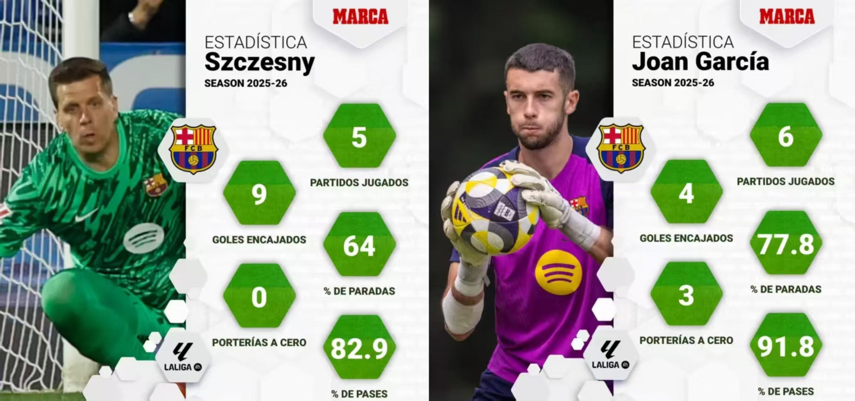 乔安-加西亚的失球数更少,扑救成功率更高,传球准确率也更高……而且最重要的是,有一个非常关键的数据:零封场次。什琴斯尼至今还未取得零封,而加西亚在他出战的七场比赛中有三场零封,最终这直接转化为了积分。正如德容在对阵布鲁日赛后所说:"如果你丢三个球,想赢球就非常困难了。"