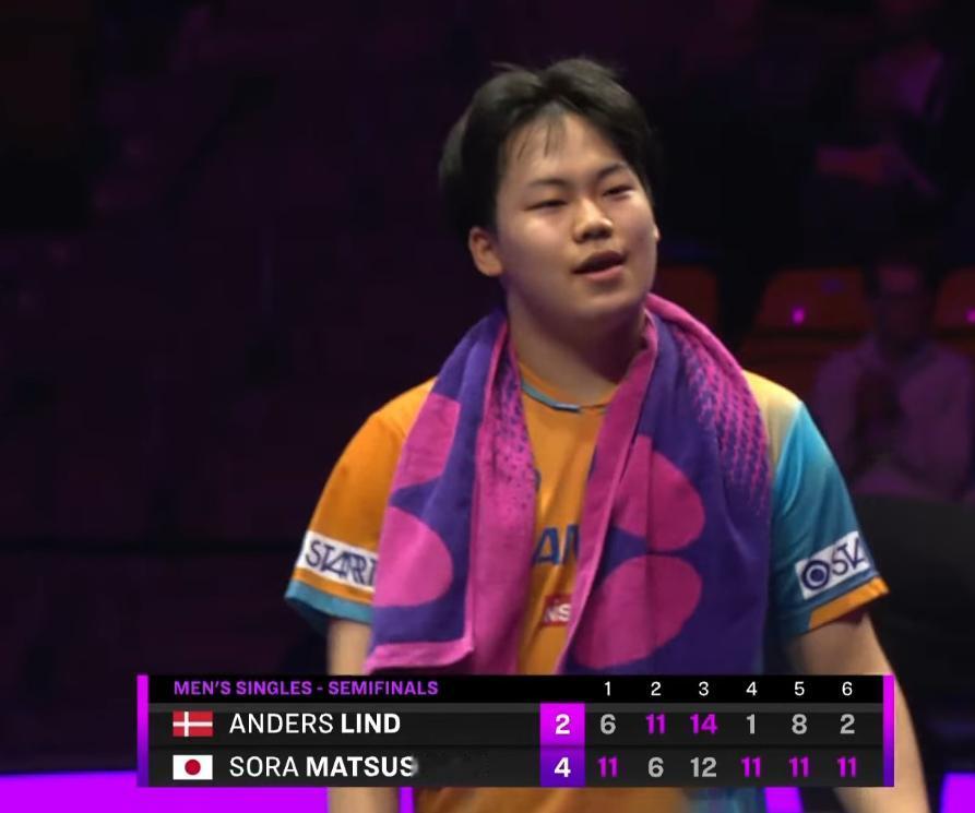 松岛辉空捡了个决赛名额, 第三局的时候, 林德3:0领先 突然请求了医疗暂停, 通过特写镜头来看, 肌肉确实变形了。 应该是去年车祸后的后遗症, 后面三局, 松岛11:1 11:8 11:2拿下了比赛, 晋级决赛。 或许他运气好, 但运气也是实力的一部分, 没办法了。
