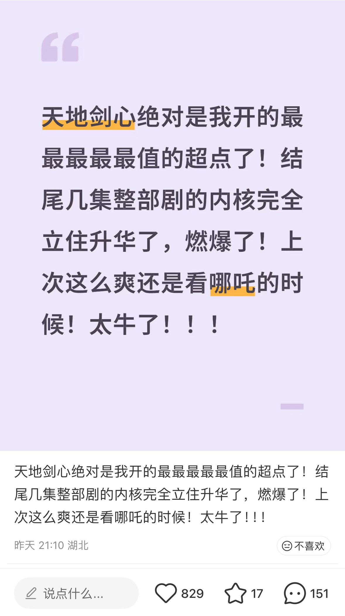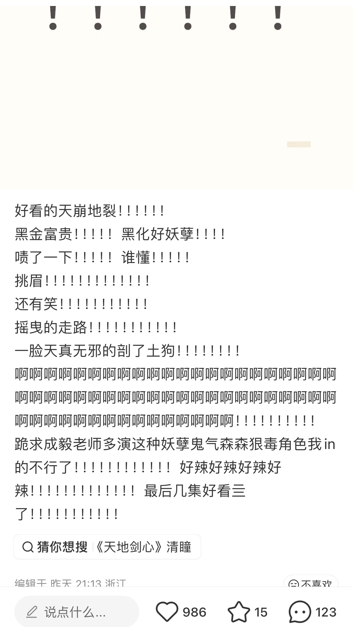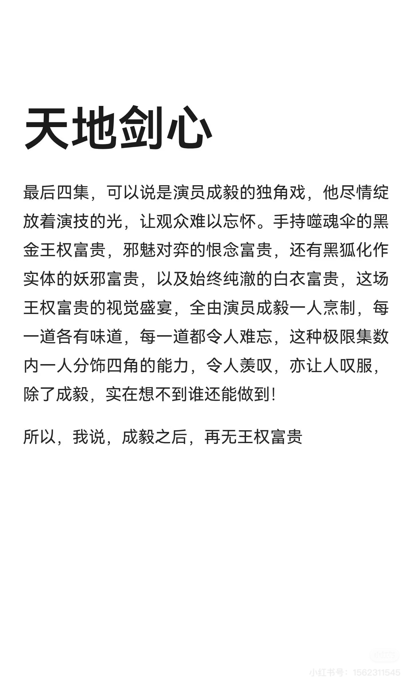 再次感谢成毅老师,全身心奉献高质量演绎,一直保持高水准守内核走主线。天地剑心结尾几集成毅老师把整部剧的内核完全立住升华了,燃爆了,下沉平台全是夸。好的演员总是会给观众带来惊喜,安抚人心,信任他。