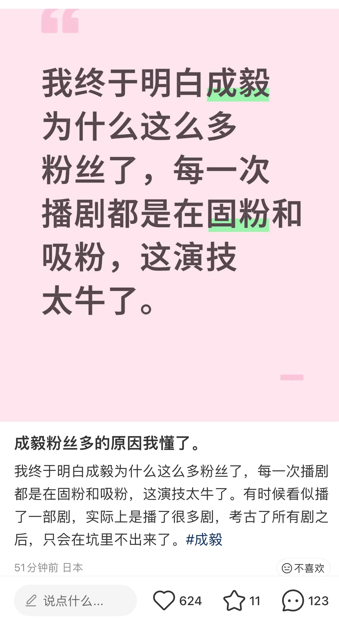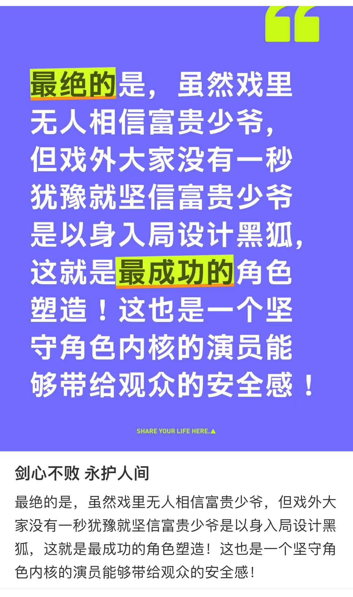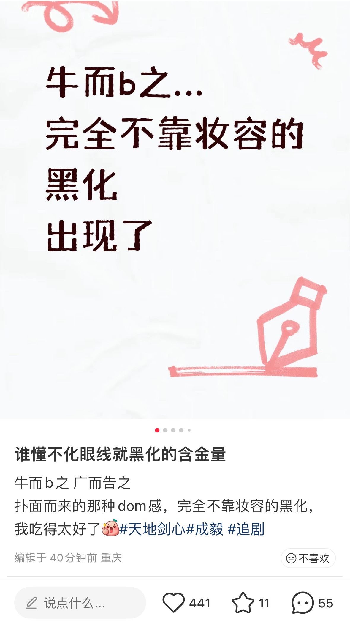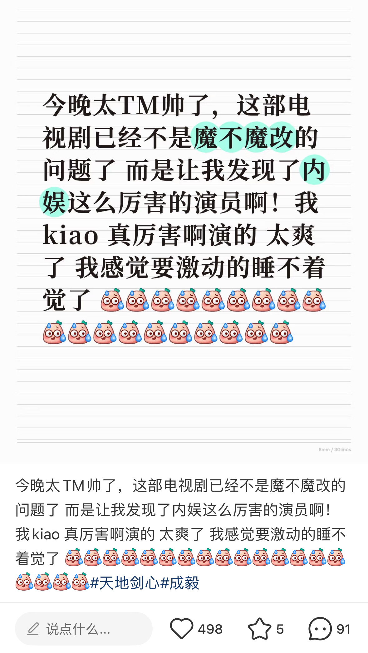 再次感谢成毅老师,全身心奉献高质量演绎,一直保持高水准守内核走主线。天地剑心结尾几集成毅老师把整部剧的内核完全立住升华了,燃爆了,下沉平台全是夸。好的演员总是会给观众带来惊喜,安抚人心,信任他。