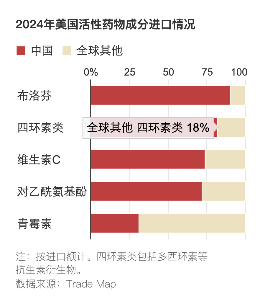 一是锂离子电池,宁德时代和比亚迪是全球动力电池产业top2,全球电池正极材料的79%,负极材料的92%,精炼化学锂产的63%,精炼钴的80%和精炼石墨的98%都是中国供应。二是半导体。中国目前约占到全球成熟制程半导体产能的三分之一。对于汽车、消费电子和国防等行业仍至关重要。被广泛用于芯片的镓和锗等矿物也主要由中国提供,美国地质调查局(U.S. Geological Survey)的数据显示,2024年中国占到全球镓产量的99%。三是制药。药品中的活性药物成分或用于制造这些活性成分的前体化学品常常是由中国供应的。