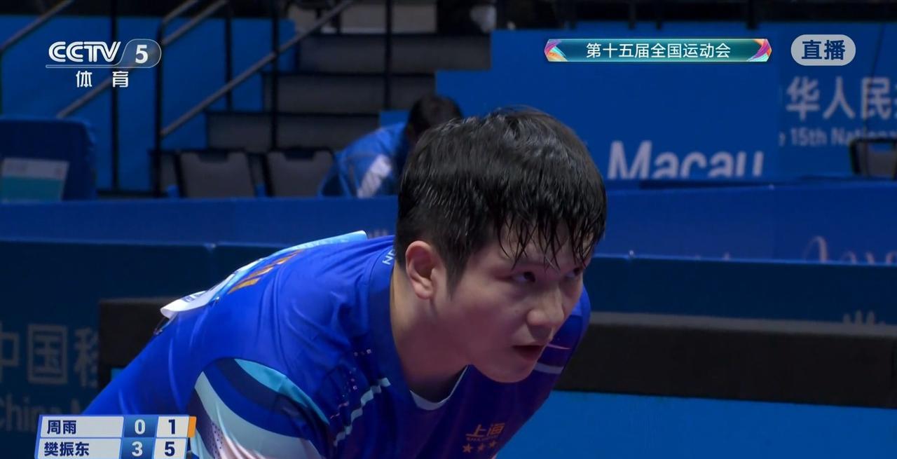 中国男乒名将樊振东真是强大到令对手胆寒!在今天进行的一场全运会乒乓球男子单打1/16决赛中,樊振东迎战河北队球员周雨。当时比赛进行到了第四局的初段,周雨在0:3落后于樊振东的情况下被迫交了一个暂停,值得一提的是,当周雨走到教练身旁时无奈的说道:“想赢樊振东一局真是太难了。” 从周雨的言语和面部表情来看,他在面对实力超群的樊振东时确实非常无奈。