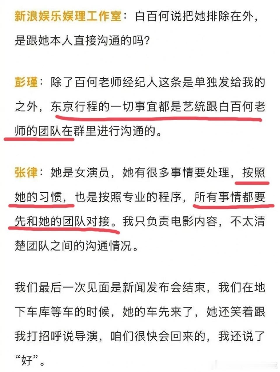白百何对制片人说有工作找我经纪人,所以制片人说东京行程都是跟白百何团队对.接的。这是按照白百何的习惯,但白百何说剧组不尊重她。