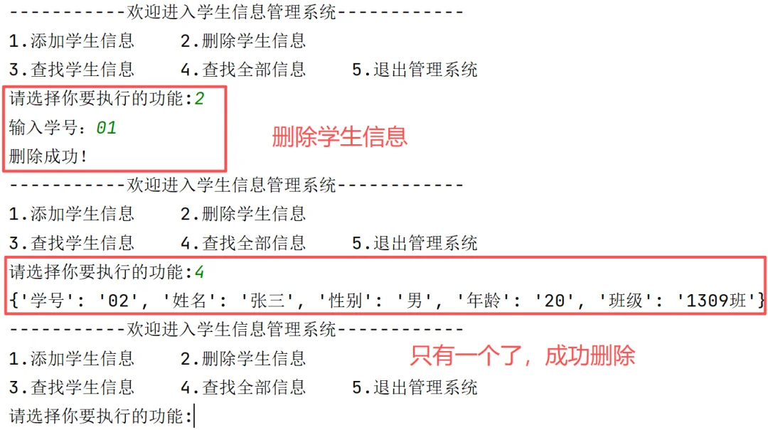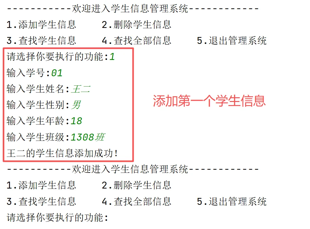 图1️⃣:学生信息管理系统主页 图2️⃣:添加第一个学生信息 图3️⃣:添加第二个学生信息 图4️⃣:查询单个学生信息 图5️⃣:查询所有学生信息 图6️⃣:删除学生信息 图7️⃣:退出管理系统 图8️⃣-图1️⃣0️⃣:完整代码❤️ ~