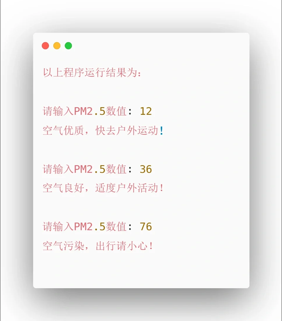 Python小项目[一R][一R][零R] ~ [一R]要求 简化PM 2.5空气质量提醒: 0~35为优,35~75为良,75以上为污染。 试根据输入的PM2.5数值,输出空气质量。 ~ [二R]程序分析 对于输入的数值,需要先转换为整型int()或者浮点型float(),使用eval()函数即可实现,再比较,使用三个单分支结构if语句,满足其条件则会输出对应的提示⚠️信息。 ~