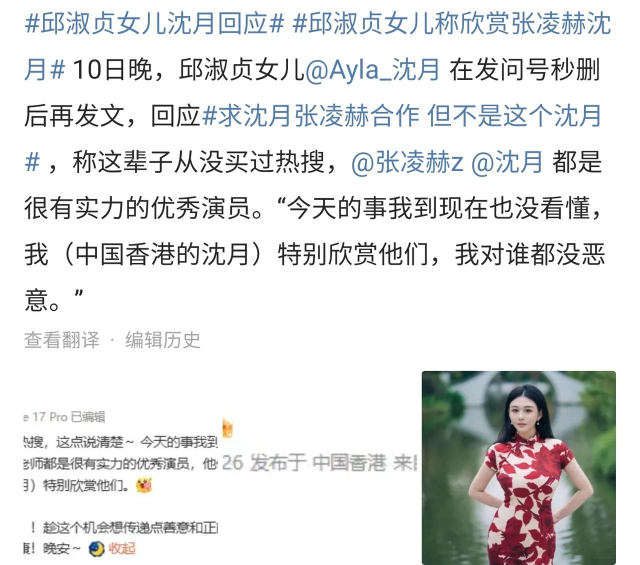 邱淑贞女儿沈月懵了,谁能想到,好好的居然吃到自己的瓜 起因是有八卦账号,突然发了一个沈月和张凌后合作的照片,一开始大家还以为是我们熟悉的那个演员沈月 结果没想到是香港女演员邱淑贞的女儿沈月,照片也是两人很久之前合作的一个东西 本来是一件很乌龙的事情,但是没想到在热搜上引发了热议 然后,邱淑贞女孩沈月就在自己账号上发了个问号,并且后面也辟谣自己花钱买热搜的事情 整体来看,确实很尴尬,娱乐圈重名的情况不多。 但几乎每一个重名的,都注定有一个尴尬 由此可见,取一个好的艺名是多么重要。