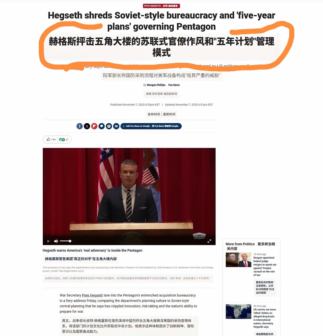 从美战争部长的直接表达中可以感受到, 老美内部的矛盾已经上升到“你死我活”的地步。 如果不是他最后说出了“对美构成严重威胁的对手”的名字。 我们单从“奉行五年计划、硕果仅存的中央计划经济堡垒、以铁腕手段压制创新”这些词语里根本猜不出是在形容老美什么组织。 当最后揭晓答案时,大家才明白原来“五角大楼”这个老六居然是这样操作的。 建议美作战部立刻开打五角大楼,来一场南北战争的重演,绝不允许“苏联式”组织存在于自由美利坚。 我们会在大洋彼岸,为你们加油点赞。