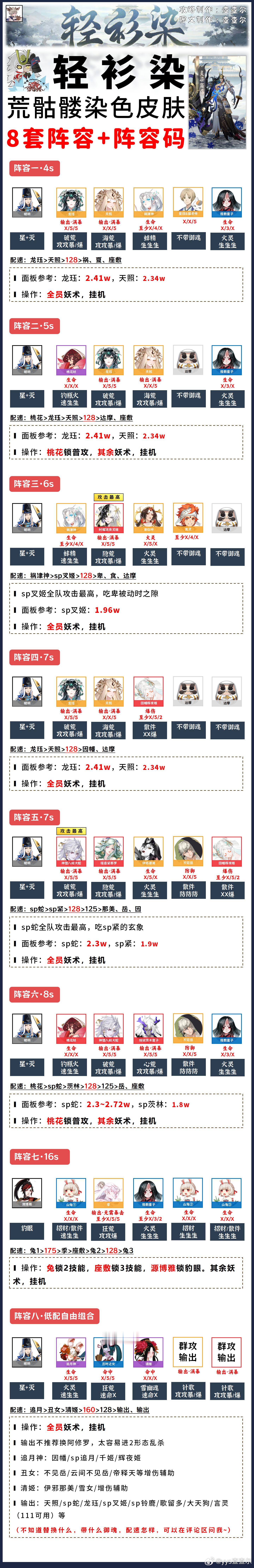 【轻衫染·荒骷髅】8套阵容+阵容码(11.12~11.18)■活动持续7天,兑换荒骷髅染色皮;■每日只推荐刷取自选50次,50次后不推荐刷了(8体/次)■战斗不享受御魂加成、没有活动buff、不能借式神
