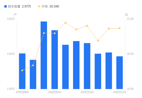 日期A股户数(户)流通A股户均持股数(股)户均持股市值(万元)2025-11-102967014614.9829.732025-10-313022514346.6229.152025-10-203004514432.5728.072025-10-103156313738.4528.192025-09-303184613616.3627.592025-09-193132113844.6028.702025-09-103340112982.4425.942025-08-313464912514.8425.032025-08-202917014865.5026.302025-08-083008514413.3824.98